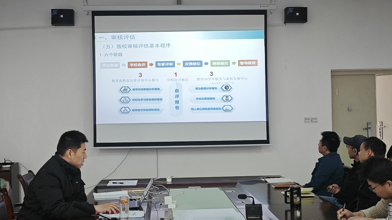 会议第二项,李庆本带领全体教职工开展本科教育教学思想大讨论专题学习。他向全体教职工讲解了新一轮教育教学审核评估的背景意义、指导原则、指标体系等方面内容,重点介绍了bat365新一轮审核评估工作的工作部署、基本程序、准备工作以及教职工应知应会等方面的知识内容。