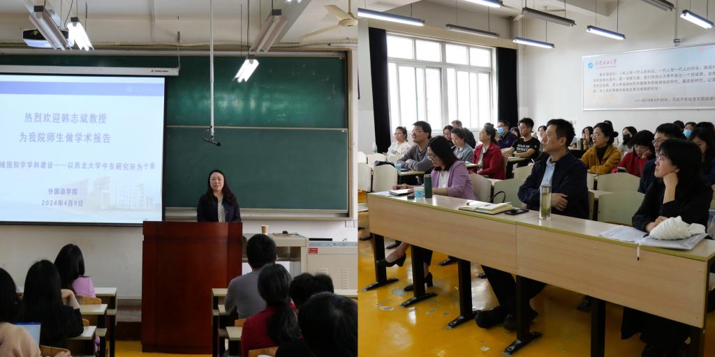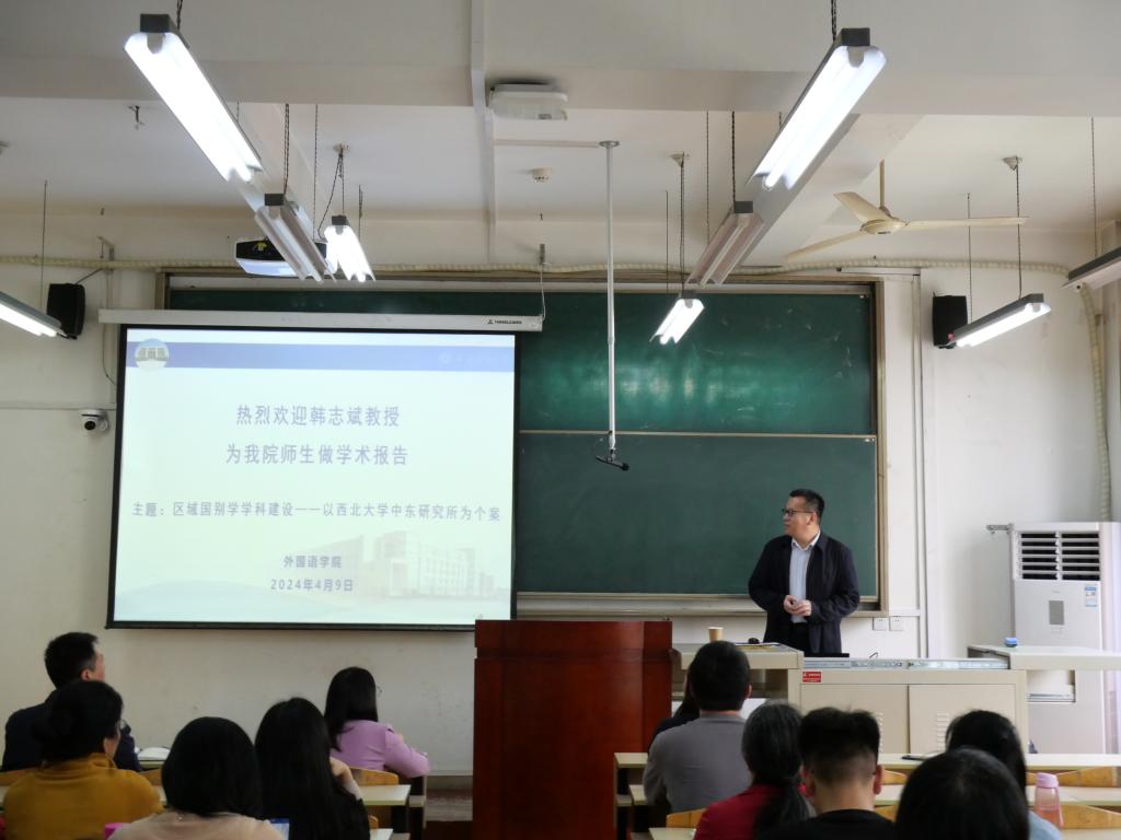 为推进bat365区域国别学学科建设,2024年4月9日下午,外国语学院邀请西北大学社科处处长、中东研究所所长、博士生导师韩志斌教授,在东方石油楼1104教室,做《区域国别学学科建设——以西北大学中东研究所为个案》专题报告。学院党委书记田虹霞、副院长刘辉、陈武、学院教师聆听了此次报告。报告由副院长刘辉主持。