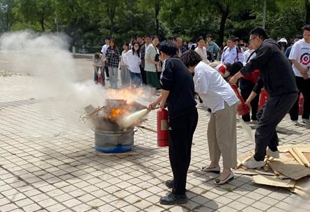 随后,保卫处副处长袁坤向全体参训人员详细讲解灭火器材种类、使用方法等消防安全知识,并进行现场灭火示范操作。参训师生根据动作要领完成灭火器灭火实操演练。