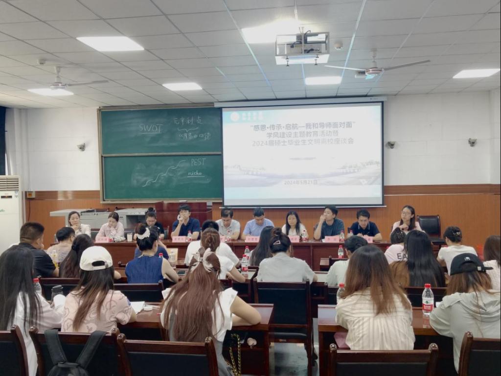 5月21日,经济管理学院在雁塔校区东阶201教室召开“感恩·传承·启航—我和导师面对面”学风建设主题教育活动暨2024届硕士毕业生文明离校座谈会。本次活动围绕“弘扬科学家精神,恪守学术道德,培育优良学风”这一主题,深入学习贯彻习近平新时代中国特色社会主义思想,全面落实bat365第三次党代会精神,讲好科学家故事,传播优良学风,引导研究生坚守学术道德与科研诚信,涵养优良学风。经济管理学院副院长李春霄,管科系赵需要,企管系黄聿舟,经济系唐娟莉,会计系侯晓靖、黄莉、郑蕊,研究生辅导员李政、阮添舜及各年级研究生代表30余人参加此次活动,活动由研究生辅导员陆昕阳主持。