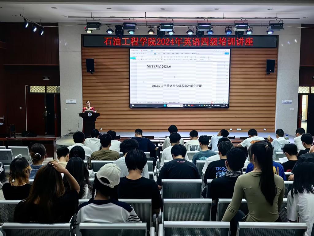 为进一步加强学风建设,提高四级考试通过率,帮助学生着眼和适应未来职业发展,石油工程学院于5月21日下午在鄠邑校区崇文楼118举办四级考前冲刺讲座。金牌主讲辅导老师郭祖凤担任主讲,2023级辅导员黄景鹏及158名2023级学生参加讲座。