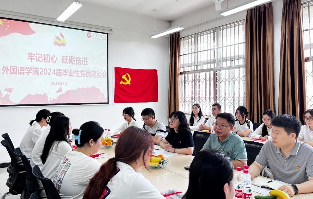 6月7日上午,外国语学院在鄠邑校区崇文楼召开2024届毕业生党员代表座谈会。学院党委书记田虹霞、副书记王业青、学生工作办公室主任周宇、辅导员陈浩及2024届毕业生党员代表参加座谈会。会议由学院党委副书记王业青主持。