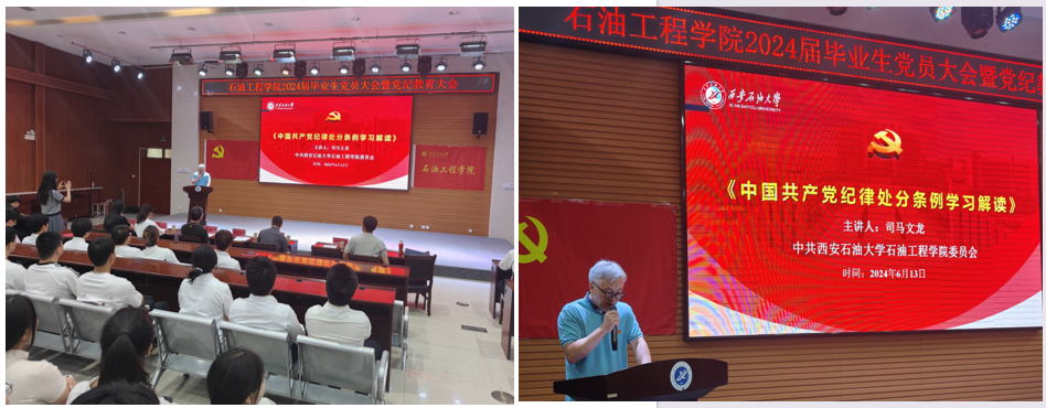 为深入推进党纪学习教育,进一步加强毕业生党员教育管理,坚定理想信念,提高党性修养,6月13日中午石油工程学院于经管人文楼118教室召开毕业生党员大会暨党纪教育大会。石油工程学院党委书记司马文龙、党委副书记张建高、学生管理办公室主任黄景鹏、各年级辅导员出席本次会议,石油工程学院全体学生党员同志参加本次活动。