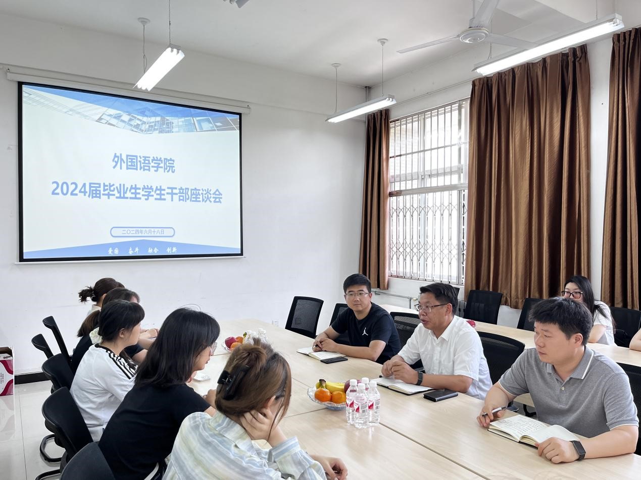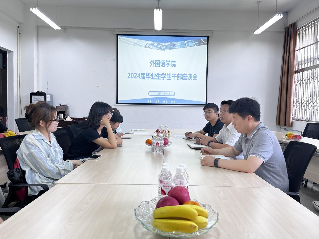 为进一步加强学院与毕业生的沟通交流,引导毕业生系好走向社会的“第一粒扣子”,外国语学院根据2024届毕业生“毕业季”相关活动安排,6月18日在崇文楼314召开2024届毕业生学生干部座谈会。学院党委副书记王业青,学生工作办公室主任周宇,毕业班辅导员陈浩及2024届毕业生学生干部代表20余人参加了座谈会。