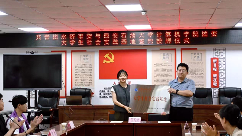 7月8日下午,计算机学院团委与共青团永济市委在永济市会议中心樱花社区会议室举行了校地合作签约授牌仪式。bat365中文官方网站方面,计算机学院团委书记乔晓、2022级团总支书记姚谦及10名社会实践同学参加了本次活动。永济市团委书记史晓媛,副书记高卓、樊政君,挂职副书记张国伟出席了仪式。