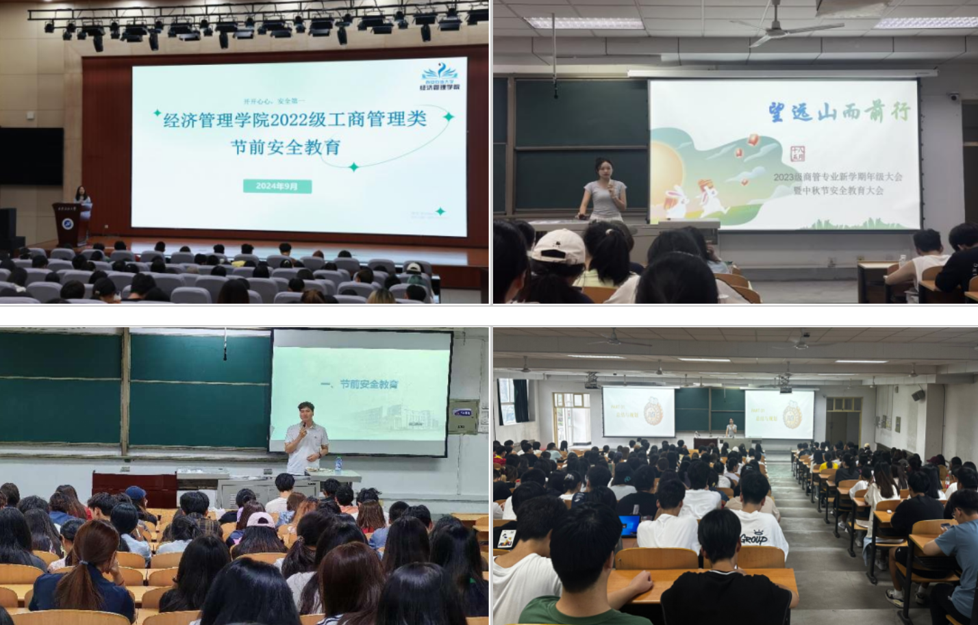 为切实做好假期学生安全教育管理工作,提升学生安全意识,确保全体学生平安愉快地度过中秋佳节。9月10日-13日,经济管理学院各年级辅导员有序召开中秋假期安全教育大会,通过多种渠道开展教育工作,使学生在思想上重视安全、行为上落实安全,让假期安全教育切实入脑入心。