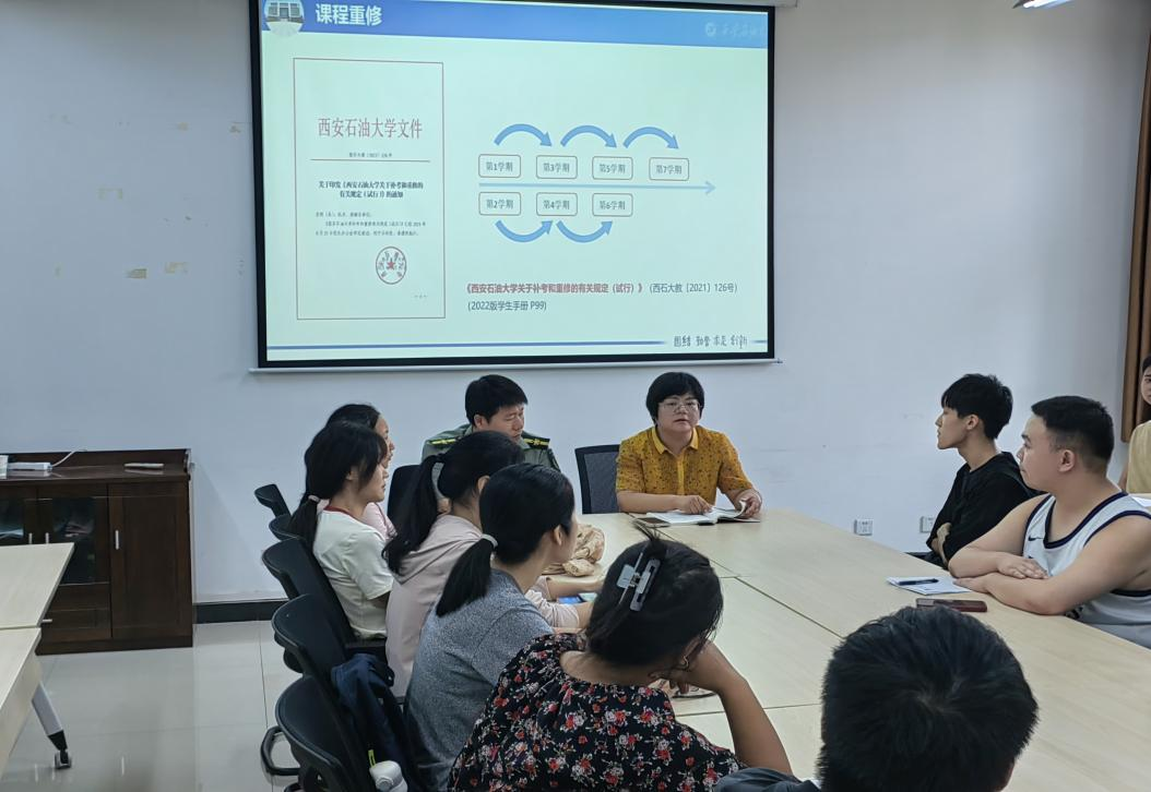 会上,尹老师以《bat365中文官方网站关于补考和重修的有关规定(试行)》(西石大教〔2021〕126号)为切入点,详细讲解了学籍异动学生关心的各类课程问题;同时从学籍管理角度,再次提醒21级准毕业生核对个人课程和成绩,尤其要对公共课加强查漏补缺,鼓励他们第7学期课程务必好好学习全部通过。