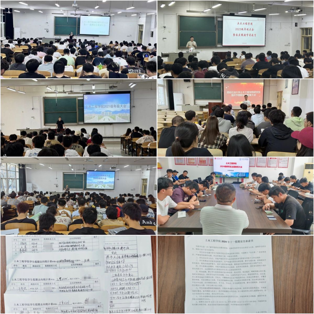 会上,辅导员分析了近期学校安全稳定形势,传达学校有关会议精神,提醒全体同学要增强安全意识,做到防火防盗防电信诈骗防溺水,拒绝“网贷”,远离黄赌毒,切实保护好自己人身和财产安全;辅导员强调了假期期间严禁进入秦岭“无人区”等事项,并且结合校园典型案例和实用的安全知识,从消防安全、饮食安全、外出安全、校园安全、网络安全、人身安全和心理安全等方面进行了全面的安全教育。全体同学签订了《土木工程学院2024年十一假期安全承诺书》,并对同学们的假期去向做了详细统计。