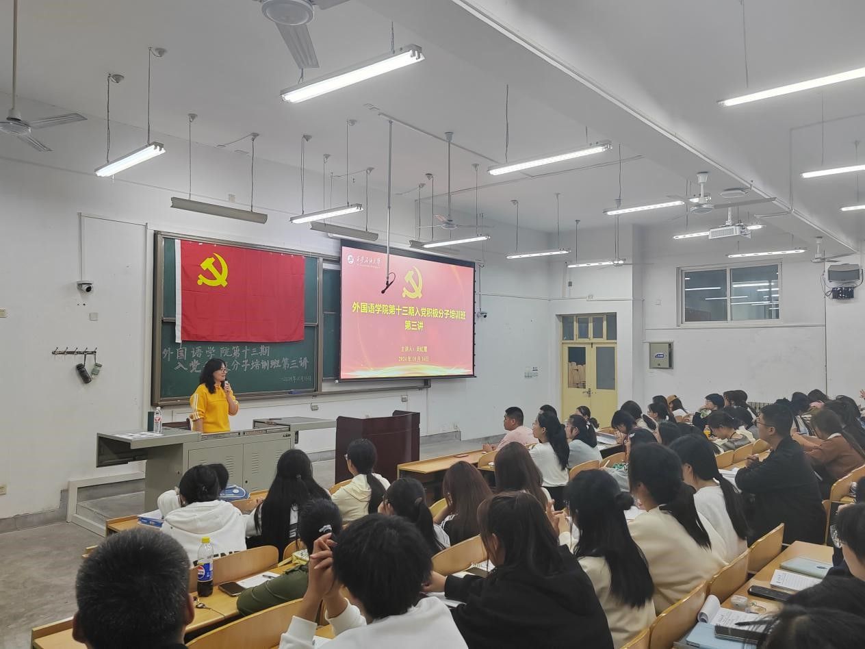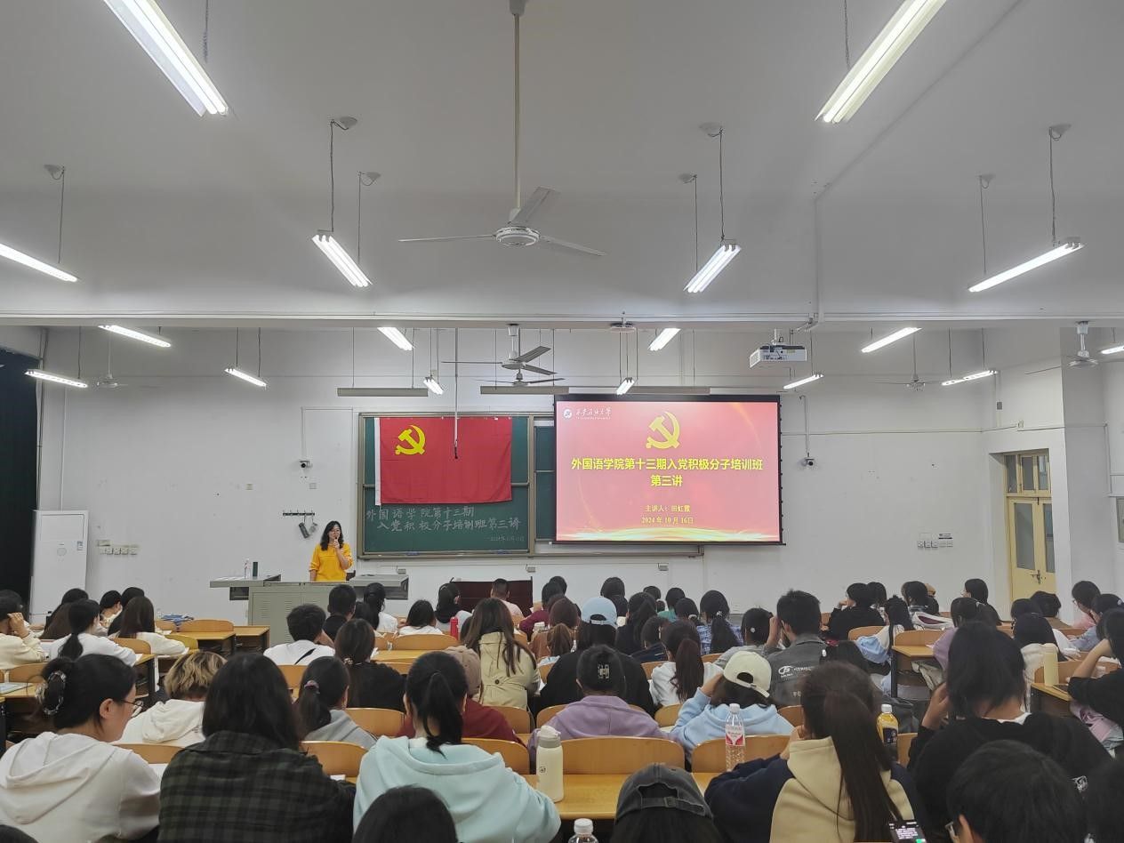 为扎实做好入党积极分子的培养教育工作,提高入党积极分子的思想政治素养,确保党员的发展质量。10月16日晚,外国语学院在鄠邑校区博思楼B114教室举行第十三期入党积极分子培训班第三次集中授课。校党委研究生工作部部长田虹霞应邀担任主讲。
