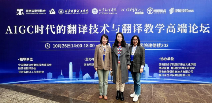 “AIGC时代的翻译技术与翻译教学”高端论坛于10月26日在西安成功举办,本次论坛由中国翻译协会翻译技术委员会、陕西省翻译协会及甘肃省翻译工作者协会指导,西安明德理工学院语言文化传播学院主办,西安翻译学院国际语言文化学院、博硕星睿翻译技术教育研究院、西安迪佳悟信息技术有限公司及福州译国译民集团有限公司协办。此次论坛汇聚了来自翻译技术与教学领域的知名专家学者,外国语学院教师原爱红、李芳蕾、拓葳参加了本次论坛。