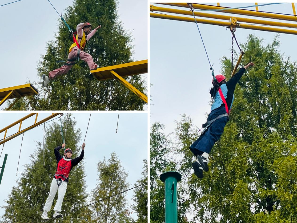 在高空项目体验中,参与同学根据分组分别进行了“断桥飞跃”、“高空滑索”和“钢丝行走”三个项目。通过队友的鼓励和自身的突破,所有同学由开始的恐惧、畏缩,逐渐坚定意志,顺利的克服了心里障碍。当最后一位同学完成挑战时,大家不禁发出了胜利的欢呼,有些同学还激动地流下了眼泪。同学们纷纷表示,队友的鼓励以及个人对团队保护人员的信任促使了勇气的形成。