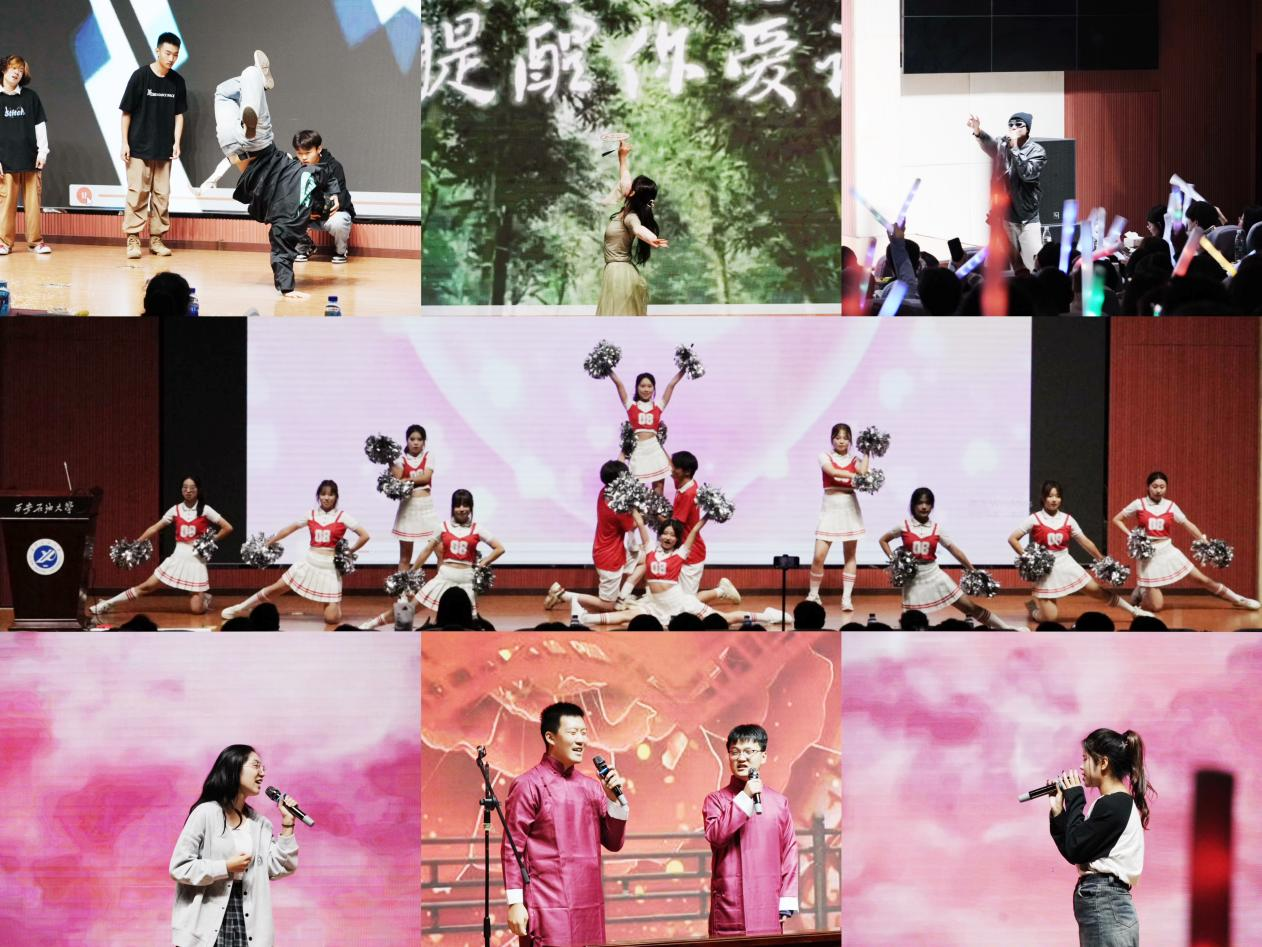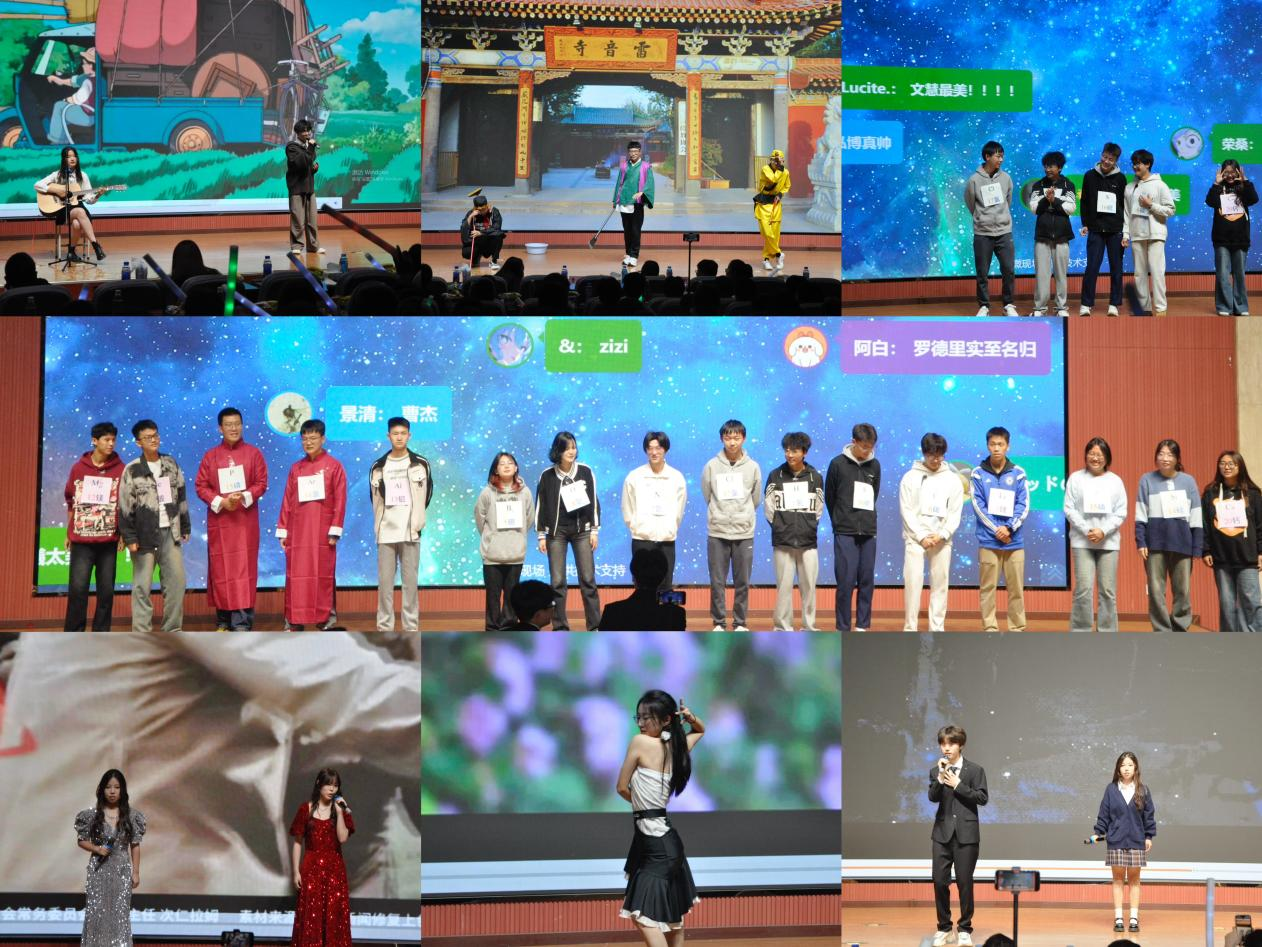 演出在团体啦啦操表演中正式拉开序幕。随后,形式多样、内容丰富的歌曲、相声、舞蹈、小品等文艺节目依次登场,奏响了同学们青春的乐章。说唱《晒》道出青年永不言败的生活态度,恰似骄阳破云,熠熠生辉;舞蹈《兰亭序》舞者们翩跹而舞,引领观众悠然领略独特东方神韵,仿若墨韵流芳,诗意氤氲;歌曲《世界上的另一个我》动人旋律悠悠奏响,丝丝缕缕,撩人心弦;相声表演中,演员妙语连珠,以幽默诙谐的话语,活灵活现地演绎人间百态;街舞《champion》活力四射,舞者们以极具爆发力的舞步,淋漓尽致地诠释当代青年的热血与霸气,仿若烈火燃情,震撼人心;歌曲《就让这大雨全都落下》音符跳跃,奏响一场情绪的磅礴大雨,如泣如诉,惹人共情;话剧《八十一难》生动诠释师徒四人西天取经那布满荆棘的征程,尽显坚毅,恰似史诗画卷,徐徐展开;吉他弹唱《世间美好与你环环相扣》浅吟低唱,引领观众漫步走进那爱意满溢的世界,静静感受人世间的美好温情,如沐春风;舞蹈《拉丁舞串烧》活力奔放,表演者们热情似火的舞步与音乐节奏相互交融,将拉丁风情展现得酣畅淋漓;歌曲《不再犹豫》激昂旋律奏响,驱散心头的迷茫,振奋人心;韩舞《世界末日》扣人心弦,表演者凭借独特舞步带领观众踏入一个震撼人心的舞蹈时空;歌曲《如愿》余音绕梁,为此次开幕式画上了圆满的句号,令人回味。