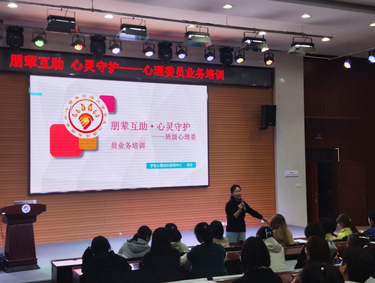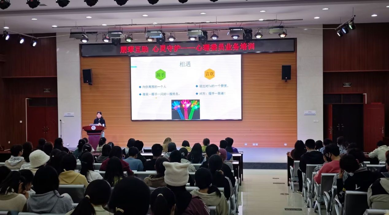10月30日晚上7:30,学生心理成长指导中心主任肖琼在鄠邑校区崇文楼118报告厅为全体2024级本科生和研究生班级心理委员及新任职心理委员们做了主题为“朋辈互助、心灵守护”的业务培训。