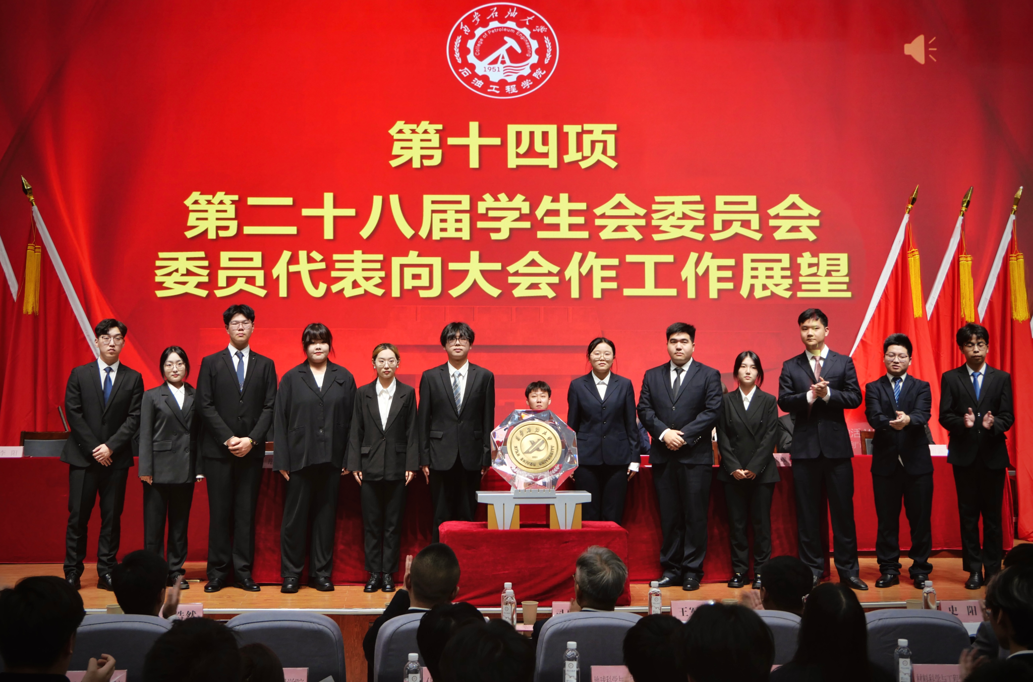 会前,播放了学院团学工作风采视频。大会圆满完成各项既定任务,在校徽的见证下通过民主投票选举产生了石油工程学院新一届学生会委员会,并公布了石油工程学院新一届学生会部门负责人名单。石油工程学院第二十八届学生会全体成员,在学生工作办公室副主任史阳的带领下,面向国旗就职宣誓。第二十八届学生会委员会代表李阳向大会作工作展望,新一届学生会委员会委员依次上台与上届学生会委员会委员握手致谢并合影留念。最后,大会在全场齐唱的《我为祖国献石油》中落下帷幕。