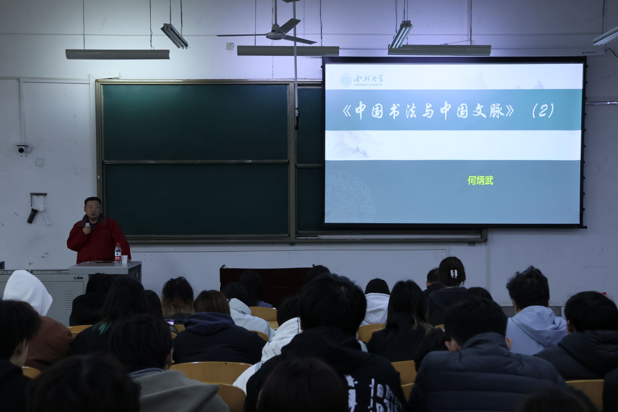 捐赠仪式结束后,何炳武先生在bat365鄠邑校区博思楼B112教室为师生作了题为《中国书法——中华文脉与文化自信》的专题讲座。人文学院院长方亭、副院长方松林、视觉传达设计专业带头人周鸣勇以及学校150余名本科生、研究生参加该讲座,讲座由人文学院方亭院长主持。