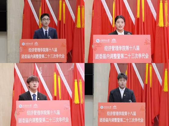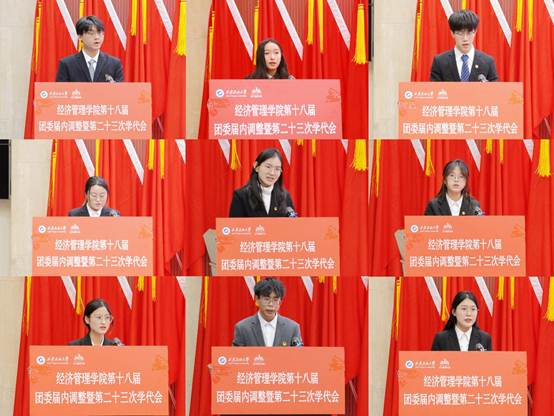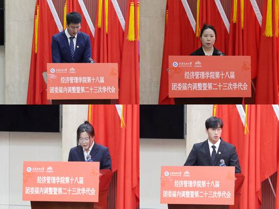 会上,学院团委书记李博文宣读了《共青团bat365中文官方网站经济管理学院委员会关于第十八届委员会组织成员调整任命的通知》,新任团委委员依次表态发言。团学指导老师任仰宣读了《第二十三次学生代表大会选举办法》,与会代表选举产生了新一届学生委员会委员。石油工程学院学生会执行主席李阳代表各兄弟院(系)学生会致以祝词,对经济管理学院团学工作的成绩表示祝贺,表示将保持密切联系,携手共进。大会听取并审议通过了《大会筹备工作报告》《第二十二届学生会年度工作报告》和《大会提案工作报告》,新任团委委员、当选学生委员会委员面向团旗进行了庄严宣誓。