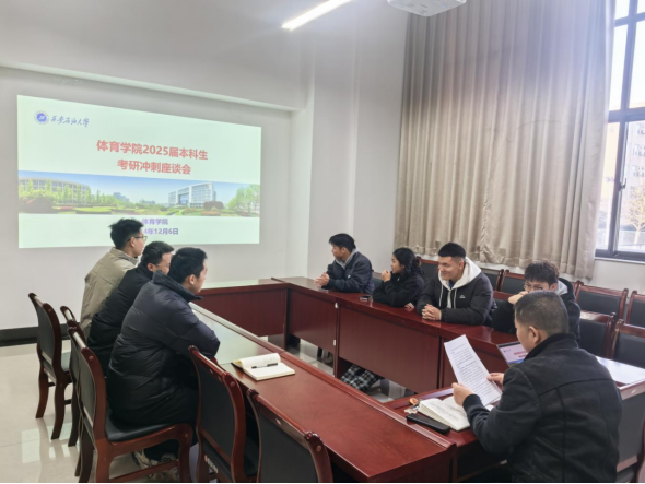 在距离2025年全国研究生入学考试半个月之际,为进一步助力2025届考研学子全力冲刺,12月6日上午,体育学院在鄠邑校区东操场208会议室召开考研冲刺学生座谈会。体育学院党总支书记苟毅飞出席会议并给学生予以考研冲刺指导与鼓励。