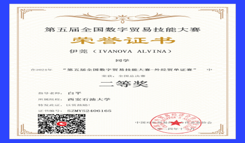 于2024年11月1日至11月30日由中国对外贸易经济合作企业协会主办,南京步惊云软件有限公司承办的第五届全国数字贸易技能大赛(外经贸单证赛项)落下帷幕。经济管理学院国贸专业留学生伊菀独立参赛并获得个人二等奖优异成绩。