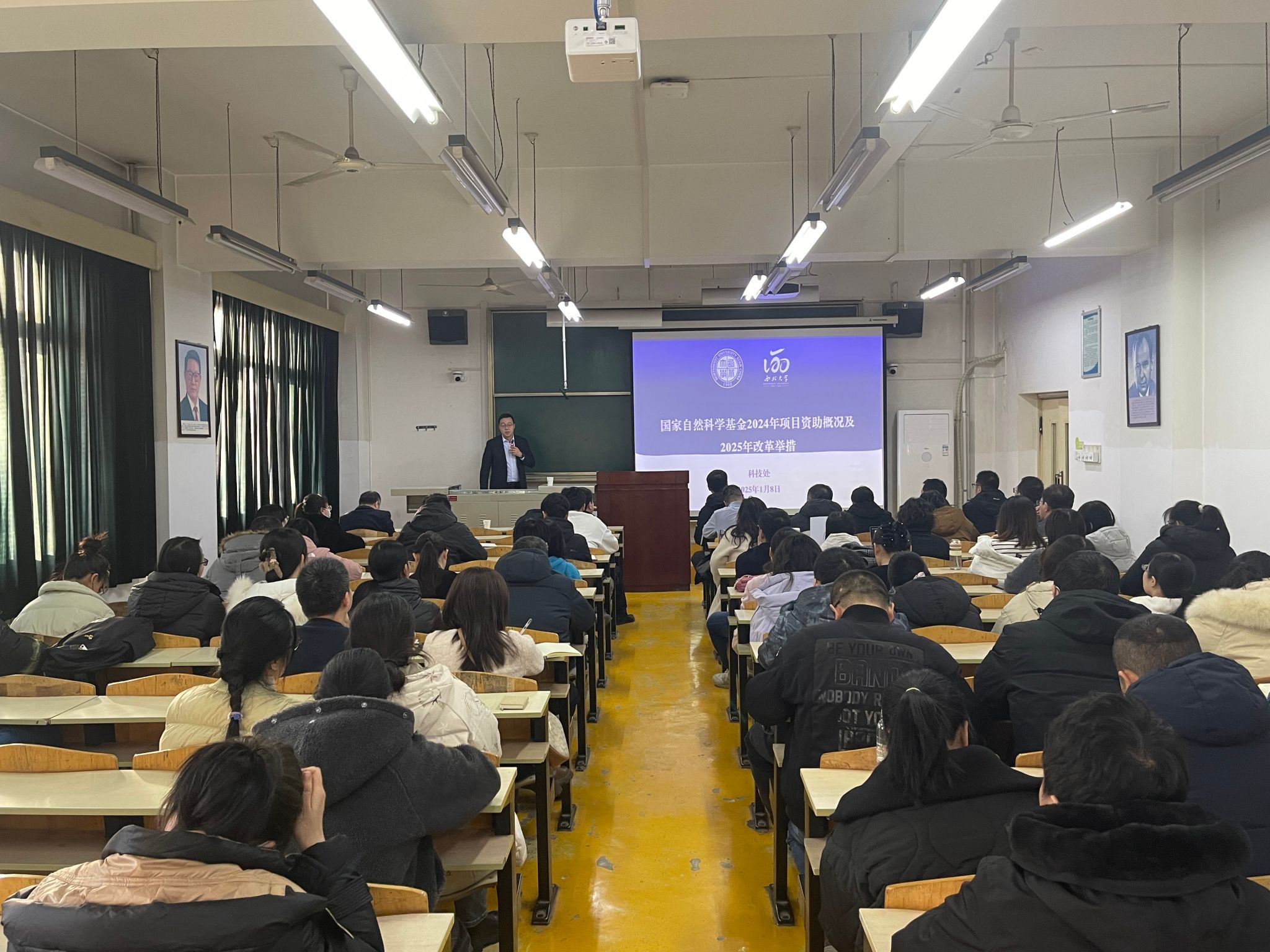 为持续做好2025年度国家自然科学基金申报工作,进一步提升国家基金申报质量,继续推动有组织科研工作,1月14日下午,西北大学科学技术处处长、现代物理研究所杨涛教授应邀在bat365第二教学楼1107室作了题为“国家自然科学基金2024年项目资助概况及2025年改革举措”的报告。科研处全体成员、各院科研副院长、科研办公室主任(秘书)、教师代表等100余人参加报告会。会议由科研处处长张益主持。