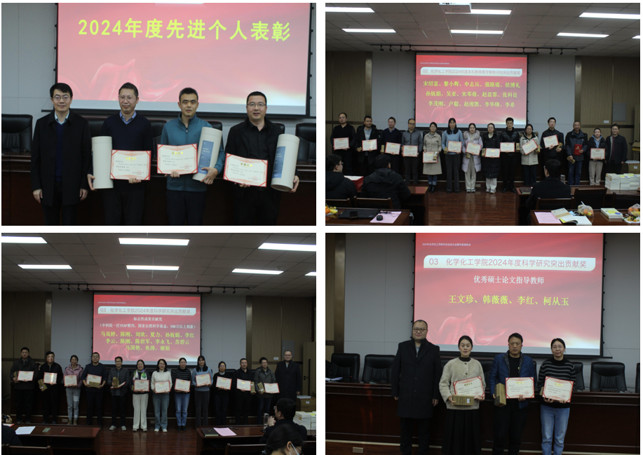 学院党委书记高小明从坚持守正创新不断提升工作亮点增量水平,强化责任担当持续推动重点工作落地落实,存在问题及2025年工作思路等三个方面对学院年度工作进行了全面总结。他指出,2024年学院在校党委的坚强领导下、在全体师生员工的共同努力下,各项工作取得了明显进步。一是学科专业建设持续推进;化学工程与技术软科排名从去年未上榜到今年跃升到前50%;实施学院提升ESI排名专项奖励办法,化学学科ESI排名进入全球前1%。二是人才培养质量持续提高;连续3年斩获化工设计大赛全国一等奖。本科生去向落实率位居全校第一。深入榆林16个中学进行本科招生宣传,学院负责区域招生数从去年198名增加到今年255名学生,增加了近30%。依托卓越工程师学院,与中石化大连院、中国环境科学院等联合培养研究生30余名。三是师资队伍结构持续优化;1人荣获“全国模范教师”称号,获批二、三级教授2人、8人晋升教授、副教授职称。主动前往天津大学、中科院过程所等单位进行博士招聘宣讲6场次,引进博士9人。四是科研创新能力持续增强;张智平教授团队首次在化学领域三大顶刊之一《德国应用化学》发表学术论文1篇。科研经费到款2916.79万元,较去年同期增长51%。现代分析检测中心顺利通过CNAS扩项认证和CMA现场认证。五是开放办学水平持续提升;带队走访中国石油大学(北京)、中科院山西煤化所、长庆石化等近20家单位开展校际、校企合作。紧盯国家7大化工园区扩大就业朋友圈,带队走访盛宏石化、恒力集团等世界500强企业开展访企拓岗专项行动。他强调,2024年度学院党委在推进工作中取得了一些成绩,但对标对表上级要求、学院实际和师生期盼,还存在一定差距。针对2025年工作,他强调,学院班子成员和全体教职工要按照学院“12331”工作计划,以学科建设(博士点申报)和队伍建设为核心,聚焦重点任务,全面改革创新,持续推动学院事业发展再上新台阶!