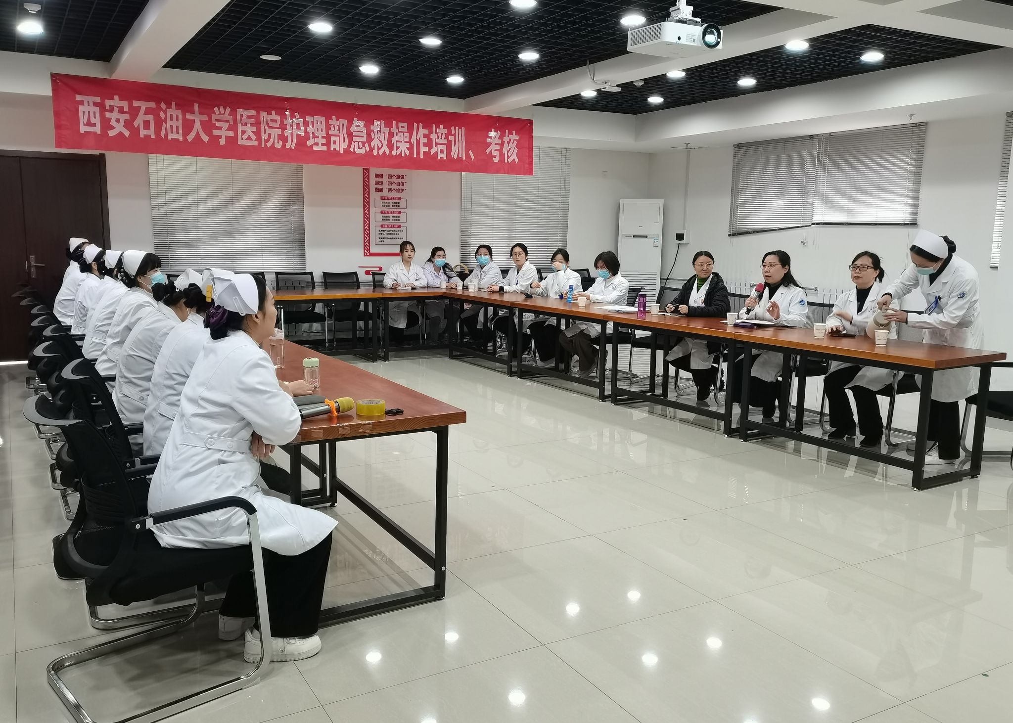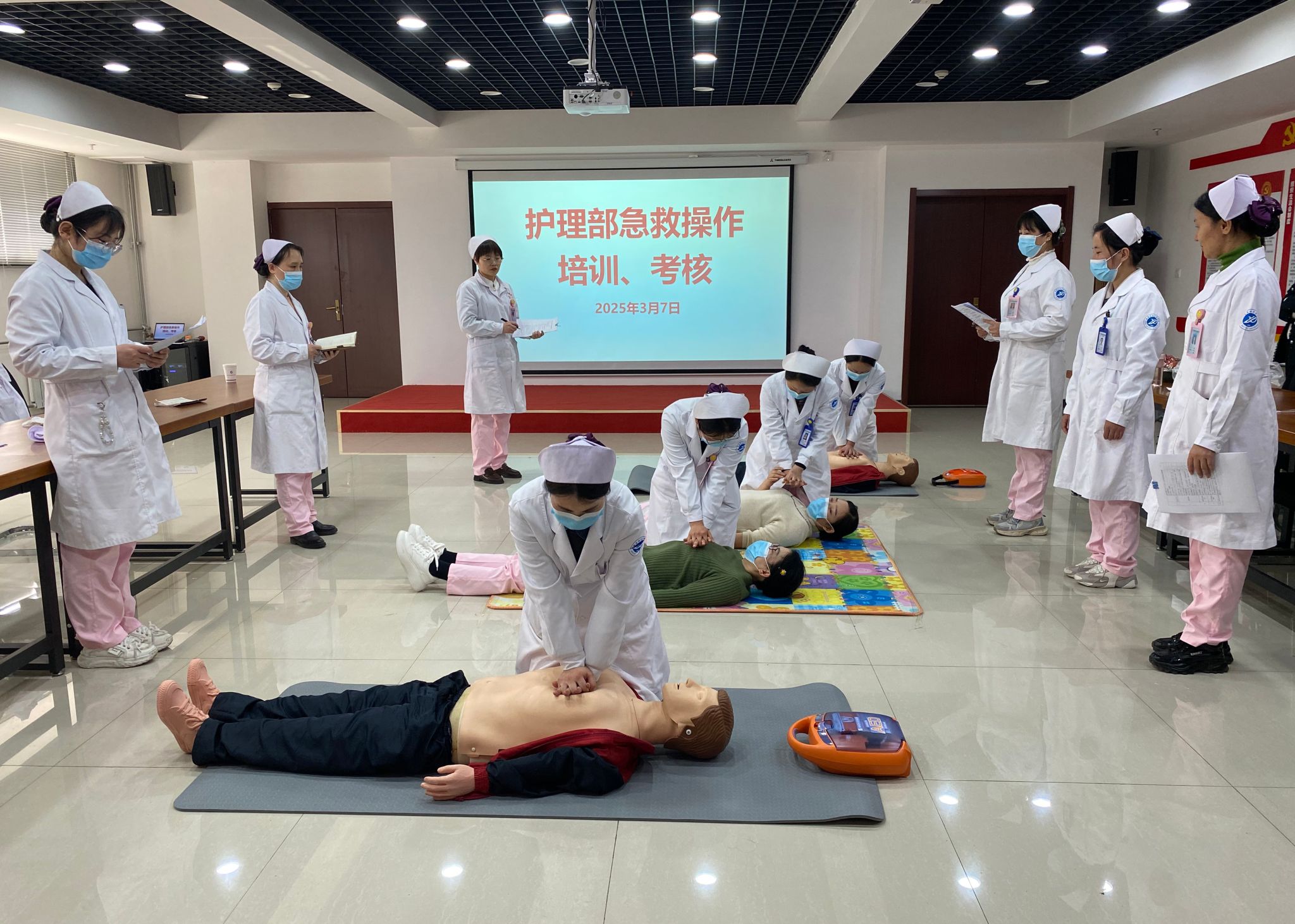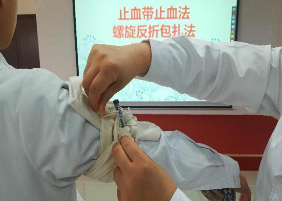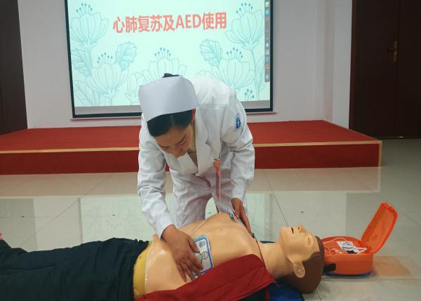 此次培训讲师为获得陕西省红十字救护师资的主管护师解姣,她详细讲解了心肺复苏技术(CPR)、自动体外除颤仪(AED)的使用、海姆立克急救法、急救包扎技术等常见急救技术理论知识,并进行了现场操作示教。