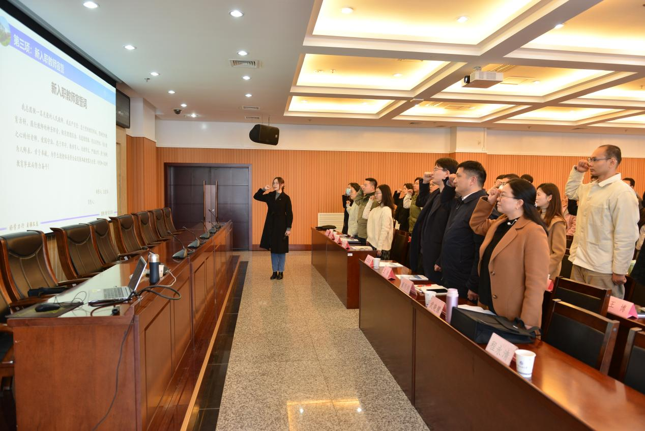 武晓朦就部门情况、新入职教师岗前培训整体情况及课程情况进行了简要介绍。新入职教师代表、石油工程学院王莹洁老师带领全体参会教师进行了宣誓,进一步增强了新入职教师的职业使命感与责任感。