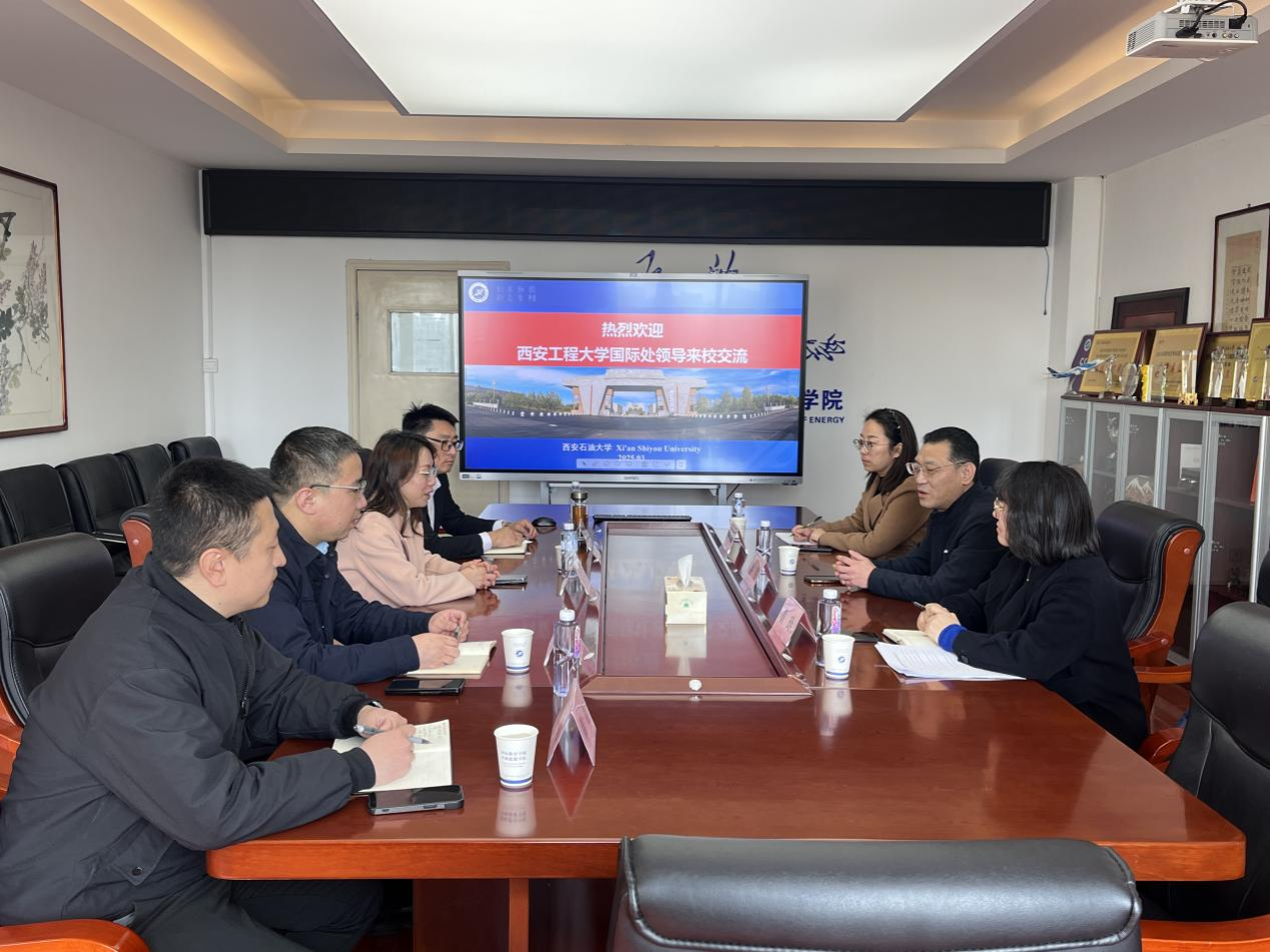 3月19日下午,西安工程大学国际合作与交流处处长秦伟、副处长黄玲及科员梁风一行来校调研交流。座谈会在雁塔校区东方石油楼801会议室举行,国际合作与交流处处长、国际教育学院院长董皓,副处长、副院长颜庭星、黄恺及国际学生工作办公室主任韩旭参加。