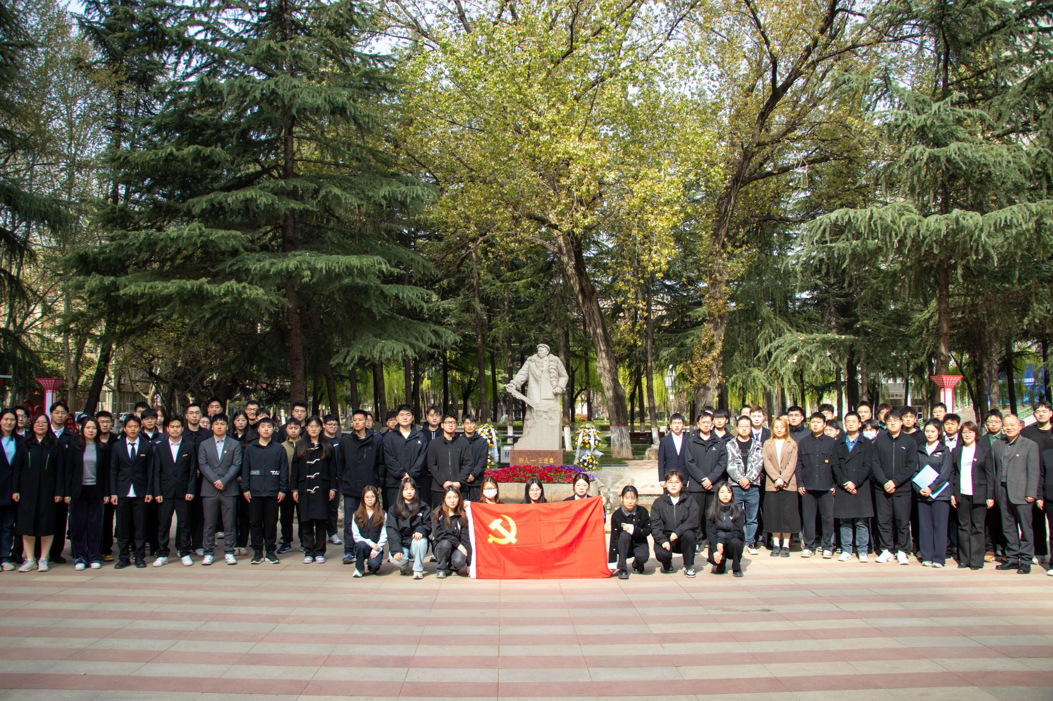 晨光中,铁人塑像巍峨矗立,寄托着无尽追思。研究生代表缓步上前,将寄托着师生敬意的花篮敬献于雕像前,与会师生向铁人王进喜塑像三鞠躬,表达对铁人王进喜的缅怀和崇敬之情。