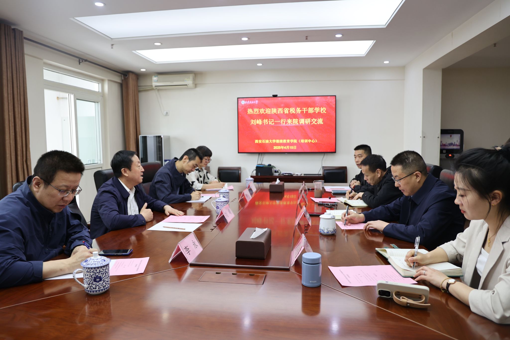 4月15日上午,陕西省税务干部学校(以下简称“省税校”)党组书记、校长刘峰一行四人前来bat365调研交流。继续教育学院党总支书记张凌寒、院长林红先参加了座谈。