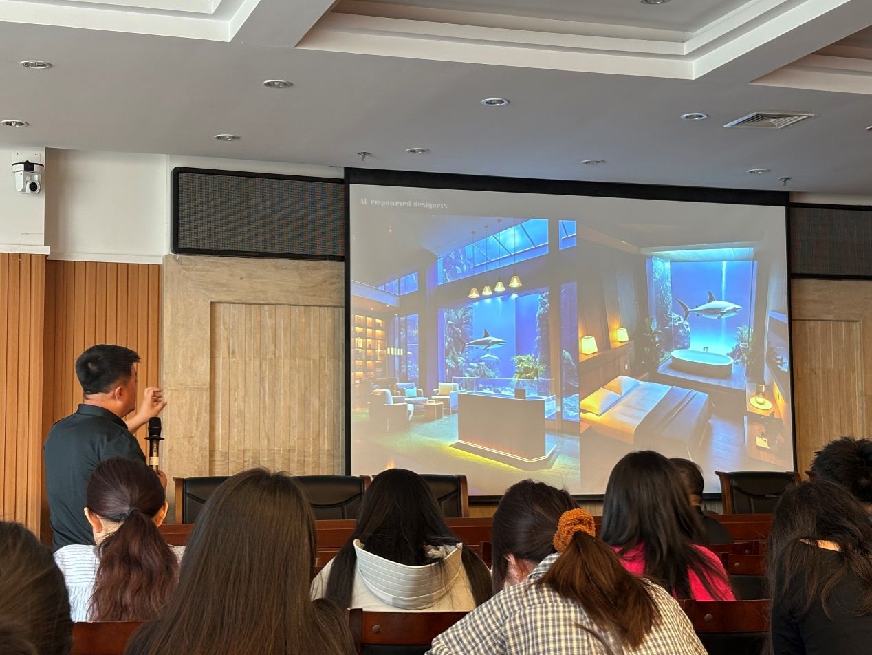 讲座伊始,孙世光以自身20多年的行业经历引入话题,回顾了设计行业从“手绘时代”到“数智时代”的演变发展。他提出当前设计师正面临双重挑战——既要保持专业上的持续创造力,又要应对新时代AI技术对传统设计行业挑战与冲击。随后他通过现场实操AI技术生成海报、建筑草图、室内环境设计等案例,生动直观地展现出AI技术在设计精度、风格形式、设计作品艺术呈现上的突破与应用,同时详细介绍了多款AI软件的特点与操作要点。