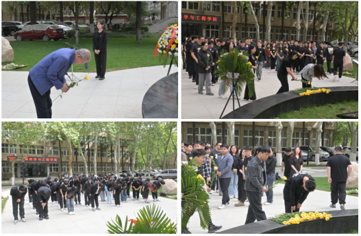 随后,全体师生庄严肃穆,面向唐春雨烈士雕像默哀一分钟,依次向唐春雨烈士敬献鲜花并鞠躬致敬。