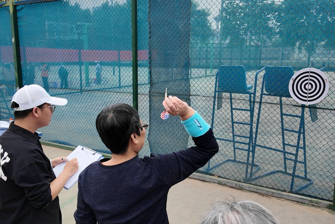 此次趣味运动会项目丰富多样,充分考虑老同志们的身体状况和兴趣爱好。门球夺标考验精准与策略,老同志们手握球杆,屏气凝神,专注瞄准目标;套圈游戏充满童趣,大家全神贯注,将手中的套圈奋力抛出,试图套住心仪的奖品;保龄球项目中,老同志们动作利落,随着球滚动,瓶倒下的瞬间,欢呼声此起彼伏;网球投准、飞镖投准、定点投篮等项目也深受欢迎,大家各展身手,现场气氛热烈。