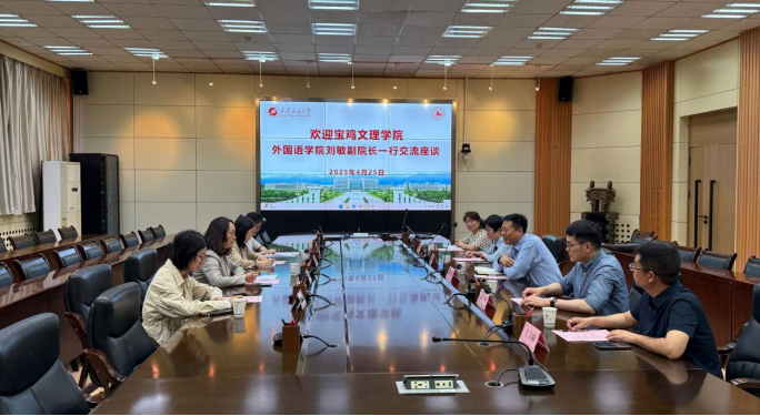 4月25日上午,宝鸡文理学院外国语学院刘敏副院长带队来bat365外国语学院座谈交流。座谈交流会在雁塔校区会议中心第二会议室召开,外国语学院副院长陈武、翻译硕士学位点负责人邓林、翻译硕士教学与研究中心主任陈柯、研究生公共外语教学部主任张虹、英语系党支部书记王文峰参加座谈会。座谈会由外国语学院副院长陈武主持。
