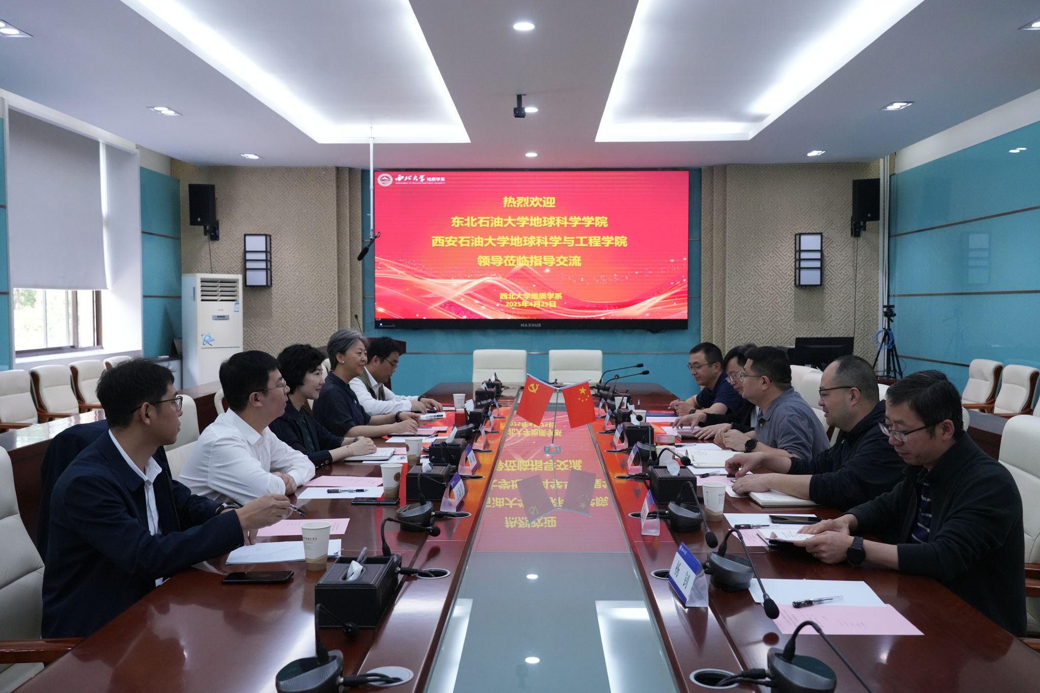 为深入贯彻落实党的二十届三中全会和全国教育大会精神,加强拔尖人才培养,4月25日上午,地球科学与工程学院党委书记高黎、院长宋立军,联合东北石油大学地球科学学院调研组,赴西北大学地质学系开展“学科交叉赋能人才培养,党建引领推动高质量发展”专题调研,聚焦新时代地质学科建设、拔尖创新人才培养体系构建及党建业务深度融合等,进一步探讨石油地学领域校际协同发展新模式。东北石油大学地球科学学院党委书记韦丹宁、院长孙雨、副院长王海学,西北大学地质学系党委副书记李政伦,副主任龙晓平、王建强、李青彦等参加会议。会议由西北大学地质学系党委书记陈峰主持。