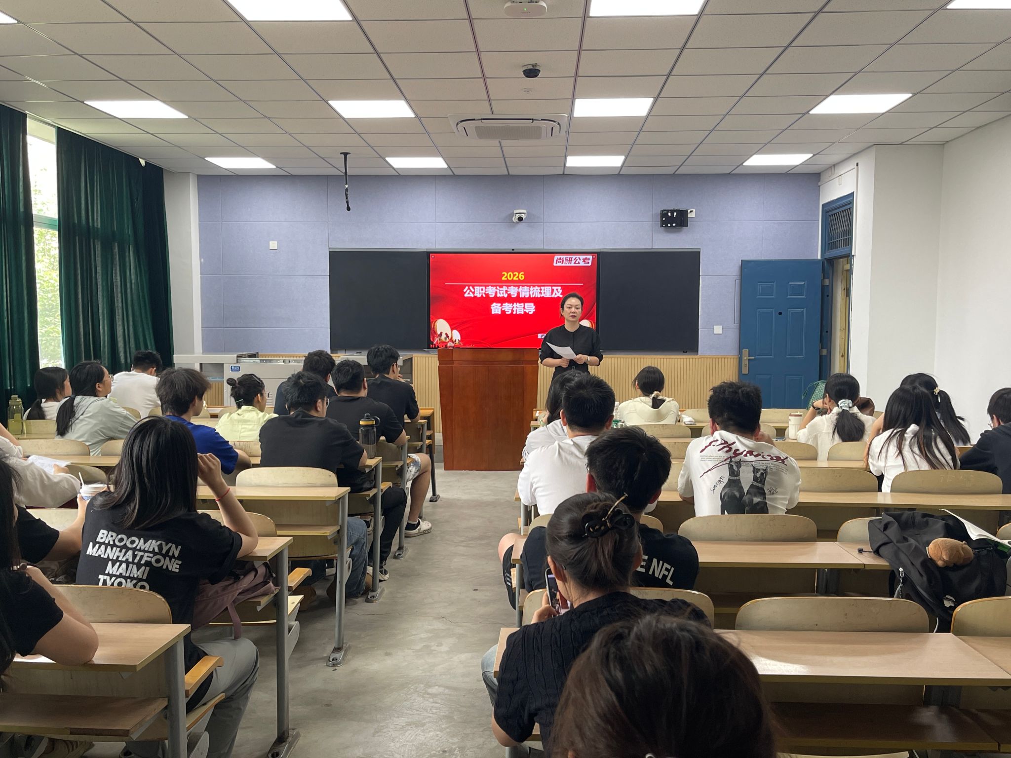 为助力2026届毕业生科学备战公务员考试,精准把握考情趋势,提升应试能力。5月7日下午,人文学院在博览楼A105举办“2026年公职考试考情梳理及备考指导”专题讲座。本次活动由人文学院联合尚研公考共同发起,人文学院党委副书记盛丹、尚研公考名师王蘅、2021级辅导员张馨元出席活动,人文学院与经管学院意向考公学生到场参与。