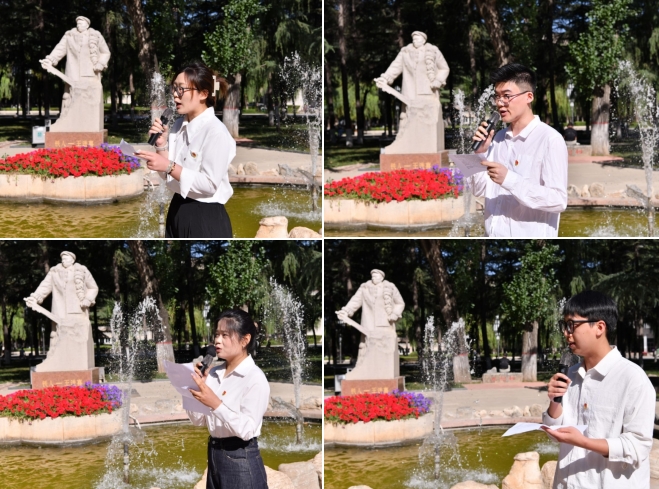 最后,学院党委书记高小明给大家讲述了一堂微党课。他讲到,在铁人广场的铁人雕像前,举办“传承铁人精神 争做西部铁人”研究生毕业班党员主题党日活动,既是对铁人精神的崇高致敬,也是对我们即将踏上新征程的毕业班党员的一次深刻党性教育。铁人王进喜,这位新中国石油工业的奠基人,以他“有条件要上,没有条件创造条件也要上”的豪迈气概,为我们树立了不朽的丰碑。他的爱国情怀、创业精神、求实态度和奉献精神,构成了铁人精神的丰富内涵,激励着一代又一代石油人不断前行。今天,师生齐聚在这里,重温入党誓词,就是要铭记初心,牢记铁人为人民服务的宗旨,将铁人精神内化于心,外化于行。他对全体毕业班党员提出三点希望:一是要传承铁人精神,坚定理想信念。铁人精神的核心是爱国和奉献,是面对困难和挑战时的不屈不挠。作为新时代的青年党员,要时刻牢记自己的初心和使命,将个人的理想追求融入到国家和民族的事业中去,为实现中华民族伟大复兴的中国梦贡献自己的力量。二是要勇担时代责任,争做西部铁人。服务国家能源战略,是我们石油人义不容辞的责任。学院大部分同学选择了在西部就业、在能源领域就业,希望大家继承和发扬“铁人精神”,牢记“将能源的饭碗牢牢的端在自己手里”,不畏艰难,勇于担当,成为能源战线上的主力军。三是要持续学习进步,发挥示范引领。希望大家在学中干、在干中学,养成终身学习的好习惯。每一名党员要牢记自己的身份和责任,发挥党员先锋模范作用。要传承铁人精神,争做西部铁人,用实际行动书写属于青年学子的精彩篇章!