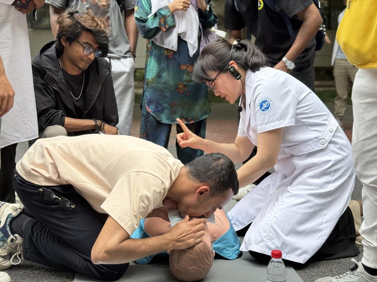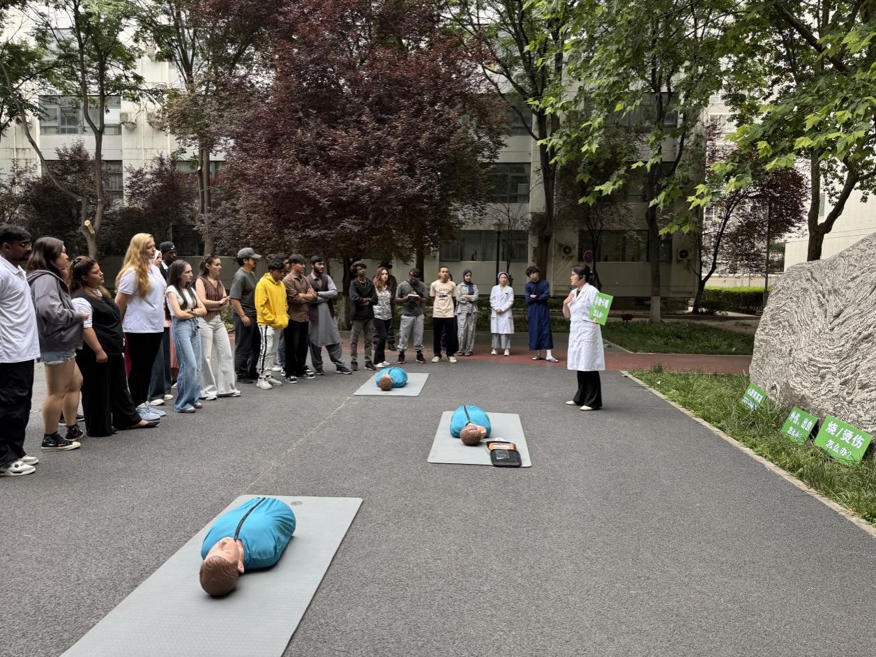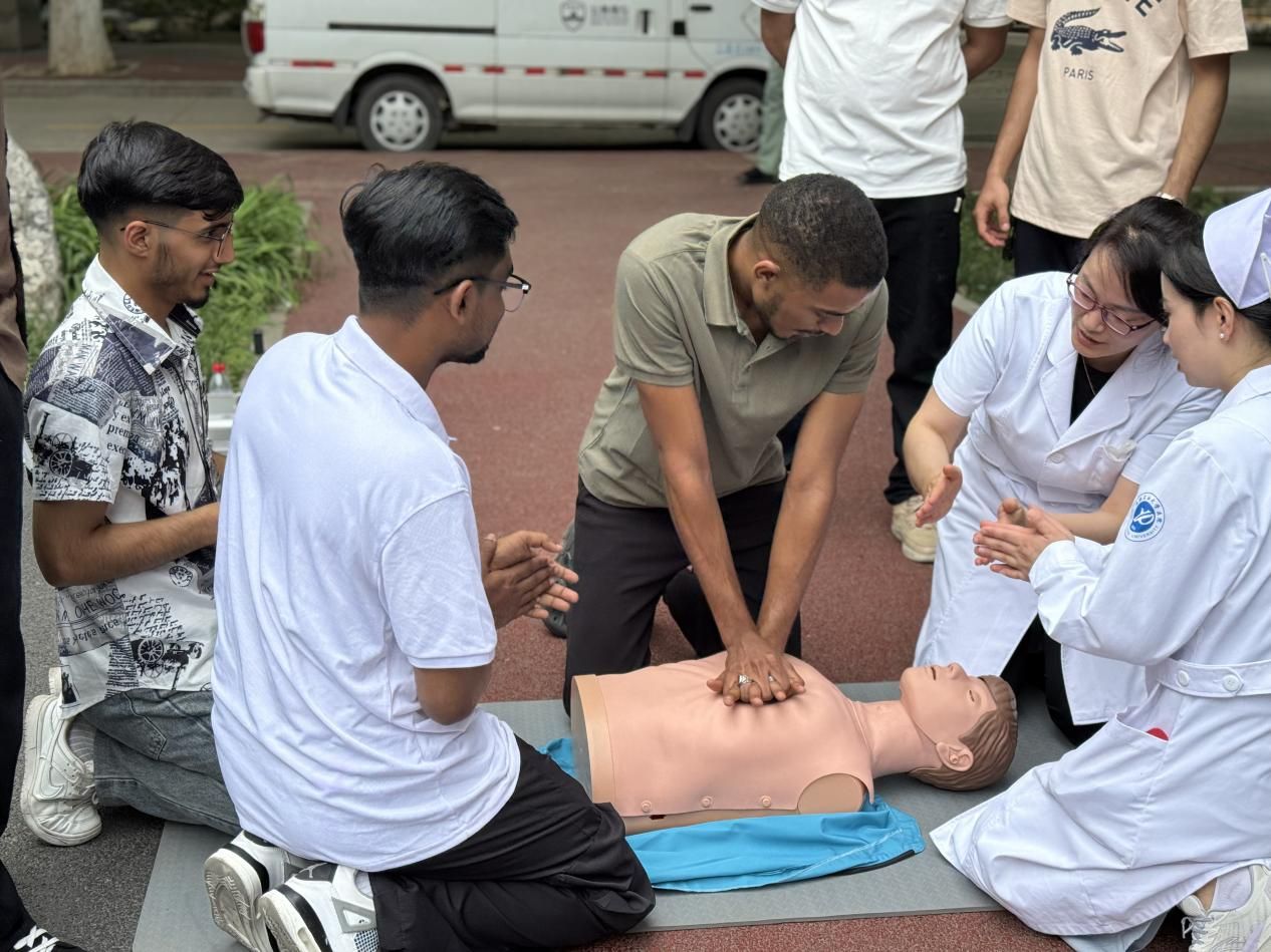 2025年6月5日上午,国际教育学院联合校医院在明德校区6号楼前广场成功举办应急救护专题培训活动。培训特邀校医院中国红十字会认证救护师宋彦霞、谭亚护士以及李纯护士现场讲授,学院辅导员及20国40余名留学生积极参训。