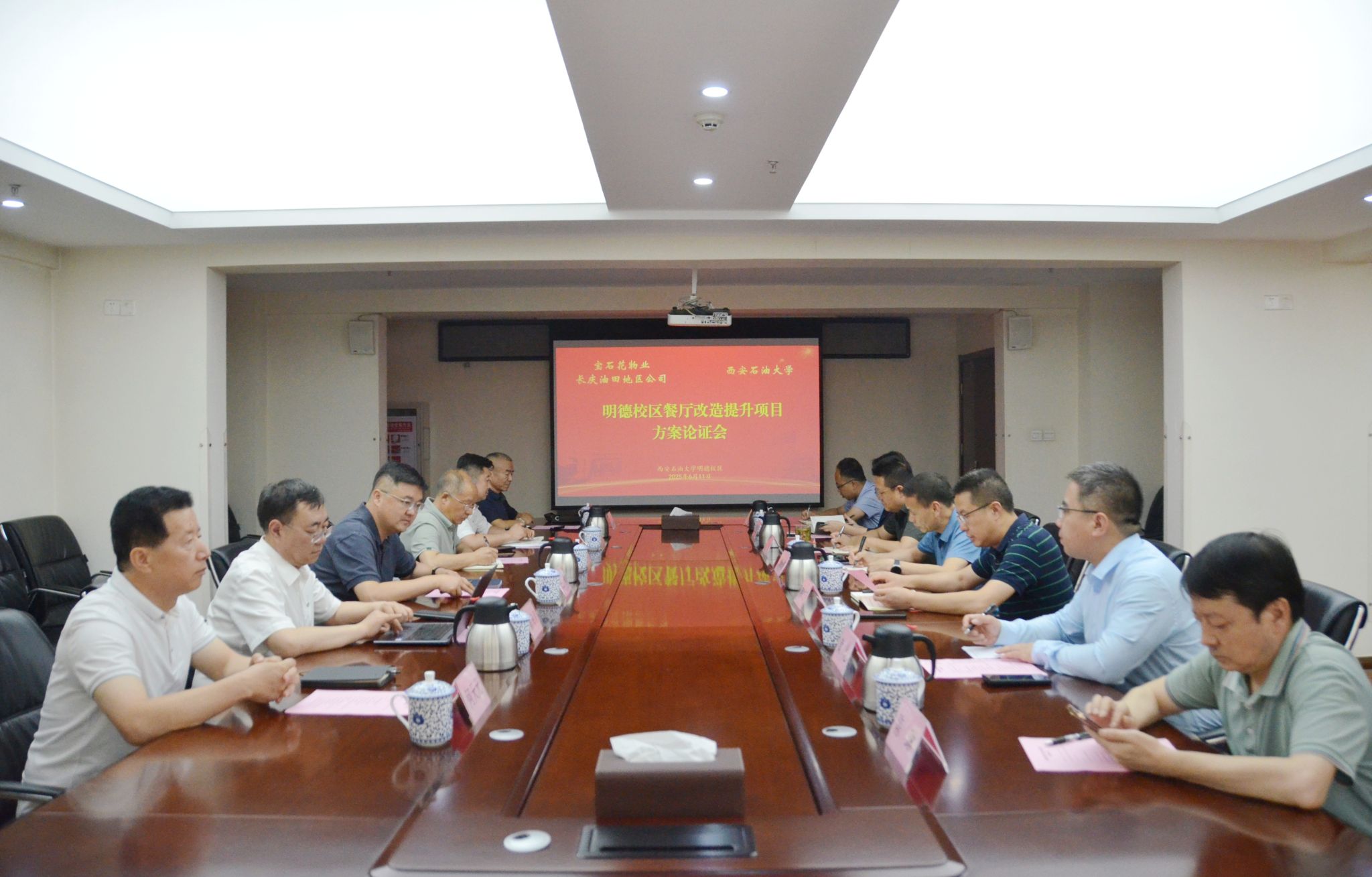 6月11日下午,学校与宝石花物业长庆油田地区公司在明德校区召开“明德校区餐厅改造提升项目”方案论证会,双方围绕项目设计方案进行深入研讨,进一步优化功能布局。宝石花物业长庆油田地区公司市场部总监王恒、运营部工程管理主任李建宁等6人,bat365研究生工作部、后勤处、国际教育学院及继续教育学院负责人参加会议。会议由继续教育学院(培训中心)院长(主任)林红先主持。
