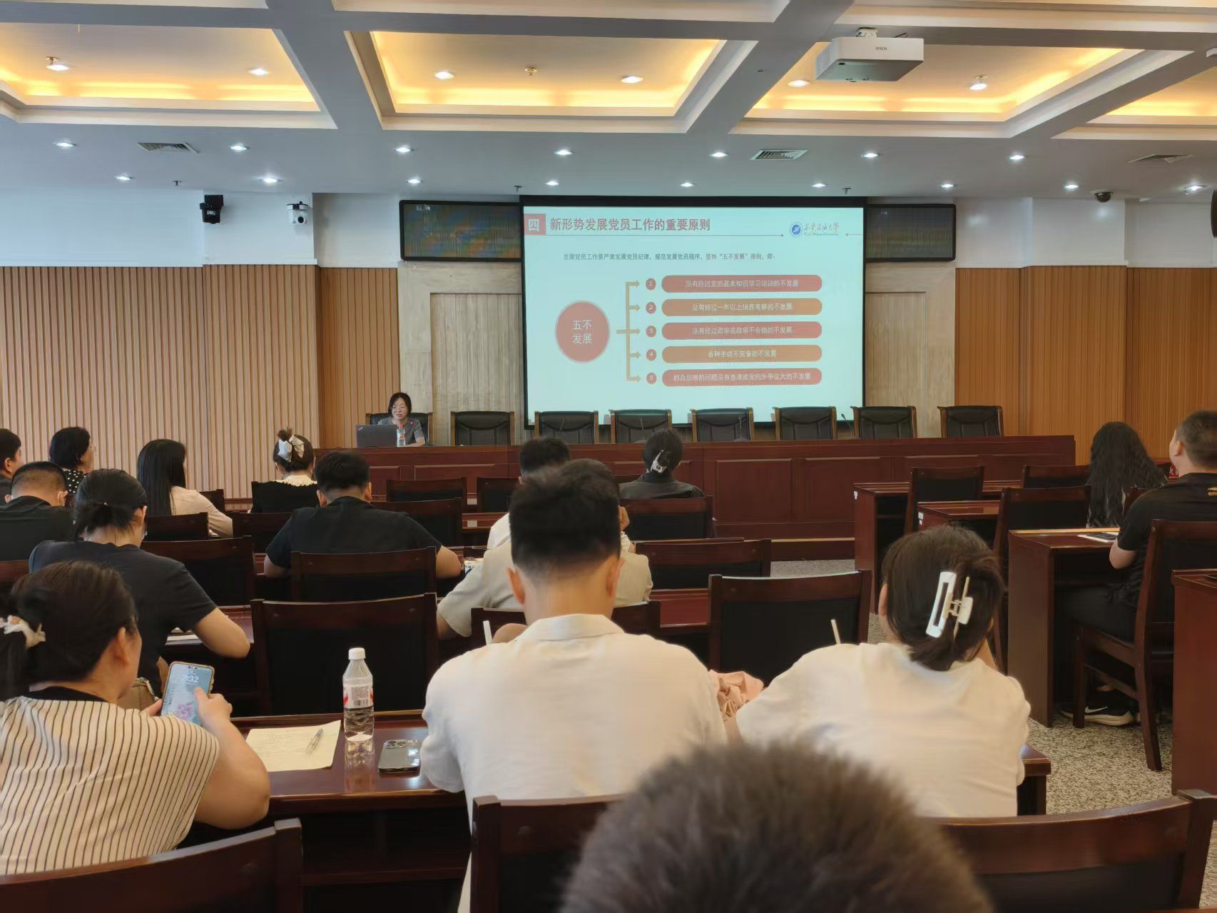 魏梦媛从新形势下发展党员的工作要求出发,详细解读了《中国共产党章程》和《中国共产党发展党员工作细则》等党内法规,强调了发展党员工作的“控制总量、优化结构、提高质量、发挥作用”十六字总要求。她通过PPT展示和现场讲解相结合的方式,将发展党员工作细分为五个阶段、25个具体步骤,逐一进行了剖析和说明,就发展对象的确定和考察、预备党员的接收、教育考察和转正等关键环节进行了重点讲解,并通过案例分析,指出了在党员发展过程中容易出现的错误和问题,提出了相应的解决措施和建议。