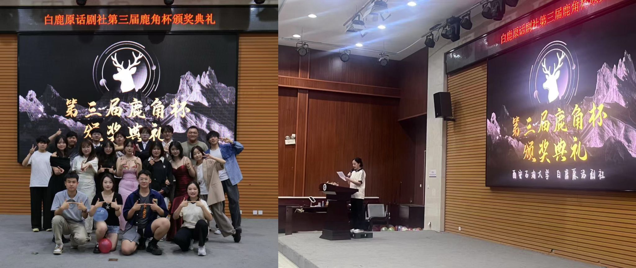 5月25日,白鹿原话剧社在崇文楼就业指导中心多功能厅举办第三届白鹿原话剧社鹿角杯颁奖典礼。表彰社团干部为社团发展做出的贡献,推动社团向前发展,通过表演新话剧展现话剧魅力,邀请同学进行才艺展示互动,共同感受话剧艺术,现场气氛热烈,受到师生一致好评。