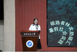 智财2301班的黄玉嘉以《青山延绵引路长,碳路通达绿意杨》为题,回顾她的“碳路者之旅”,她们的团队已连续2年在家乡各地开展林业碳汇的实践和调研,调研包含河南、江西等六个省份,与林业局的工作人员深入交流,了解现实情况以及当前所面临的困境。黄玉嘉说:未来,他们团队将继续秉持绿色发展理念,在社会实践中践行“双碳”使命,丰富创新宣传形式,与政府加强交流与合作。