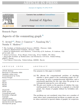 发表在Journal of Algebra的论文“Aspects of the commuting graph”主要研究了有限群的交换图,全文共61页,作者顺序按姓氏字母排列,依次为印度钦奈数学研究所V. Arvind教授、英国圣安德鲁斯大学Peter J. Cameron教授、理学院马儇龙副教授及俄罗斯科学院乌拉尔分院克拉索夫斯基数学和力学研究所首席研究员Natalia V. Maslova教授。群上交换图的研究最早起源于1955年,本文系统探讨了判定给定图是否为有限群上交换图的算法问题,且针对超特殊p-群(p为奇素数),给出了多项式算法。此外,就“分类交换图是余图或弦图时所对应的有限群”这一公开问题进行了深入研究;特别地,分类了交换图为余图时的所有有限单群。该工作得到了国家自然科学基金项目的大力支持和资助。