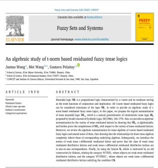 发表在Fuzzy Sets and System的论文“An algebraic study of t-norm based residuated fuzzy tense logics”主要研究了基于三角模的剩余模糊时态逻辑的代数理论,理学院王军涛副教授为论文的第一作者,bat365中文官方网站理学院为论文的第一署名单位。1986年,著名逻辑学家W.B. Ewald在论文[Intuitionistic tense and modal logic, Journal ofSymbolicLogic,51 (1986)]中构建了直觉时态逻辑的公理系统IKt.本文指出了IKt并非是独立的,在此基础之上构建了基于三角模剩余模糊时态逻辑的公理化系统,并从泛代数角度通过语义扩张形式构建了基于三角模剩余模糊时态逻辑的代数语义体系,进而为剩余模糊时态逻辑提供了统一的代数处理框架,同时从范畴角度找到了时态剩余格范畴的等价范畴,得到了其一种简易化的表示性定理。