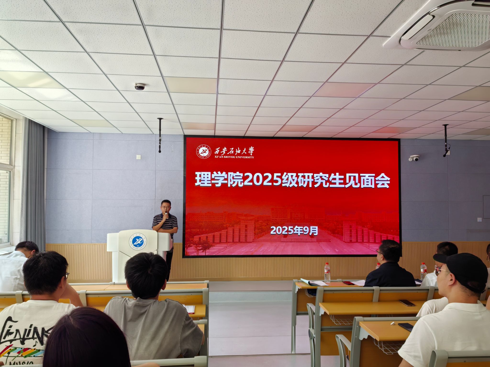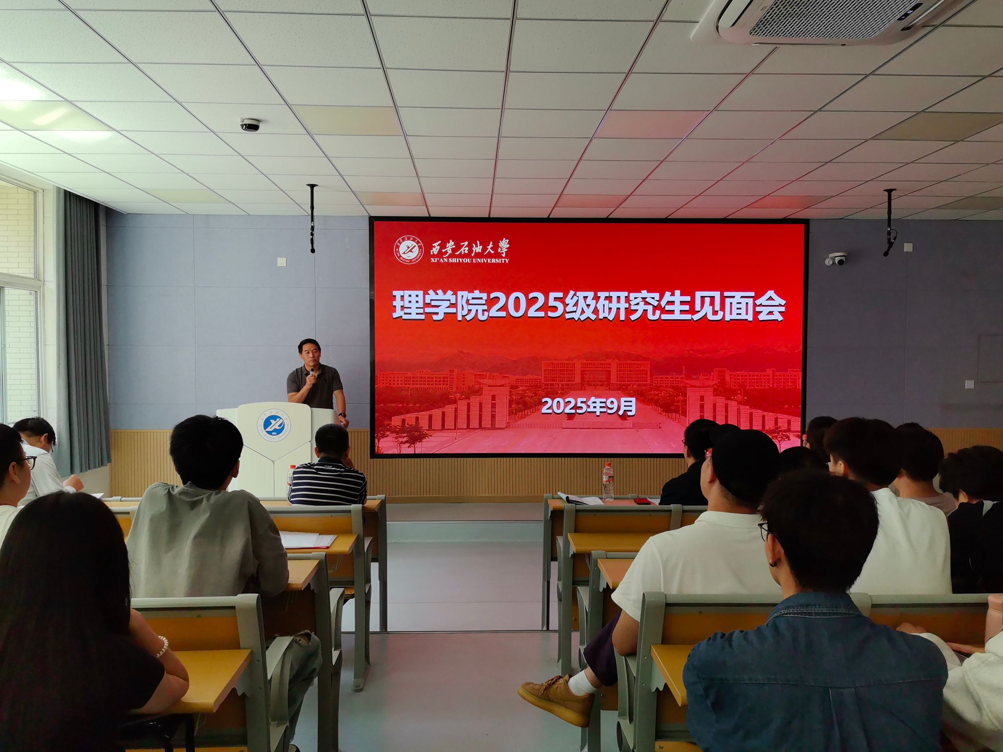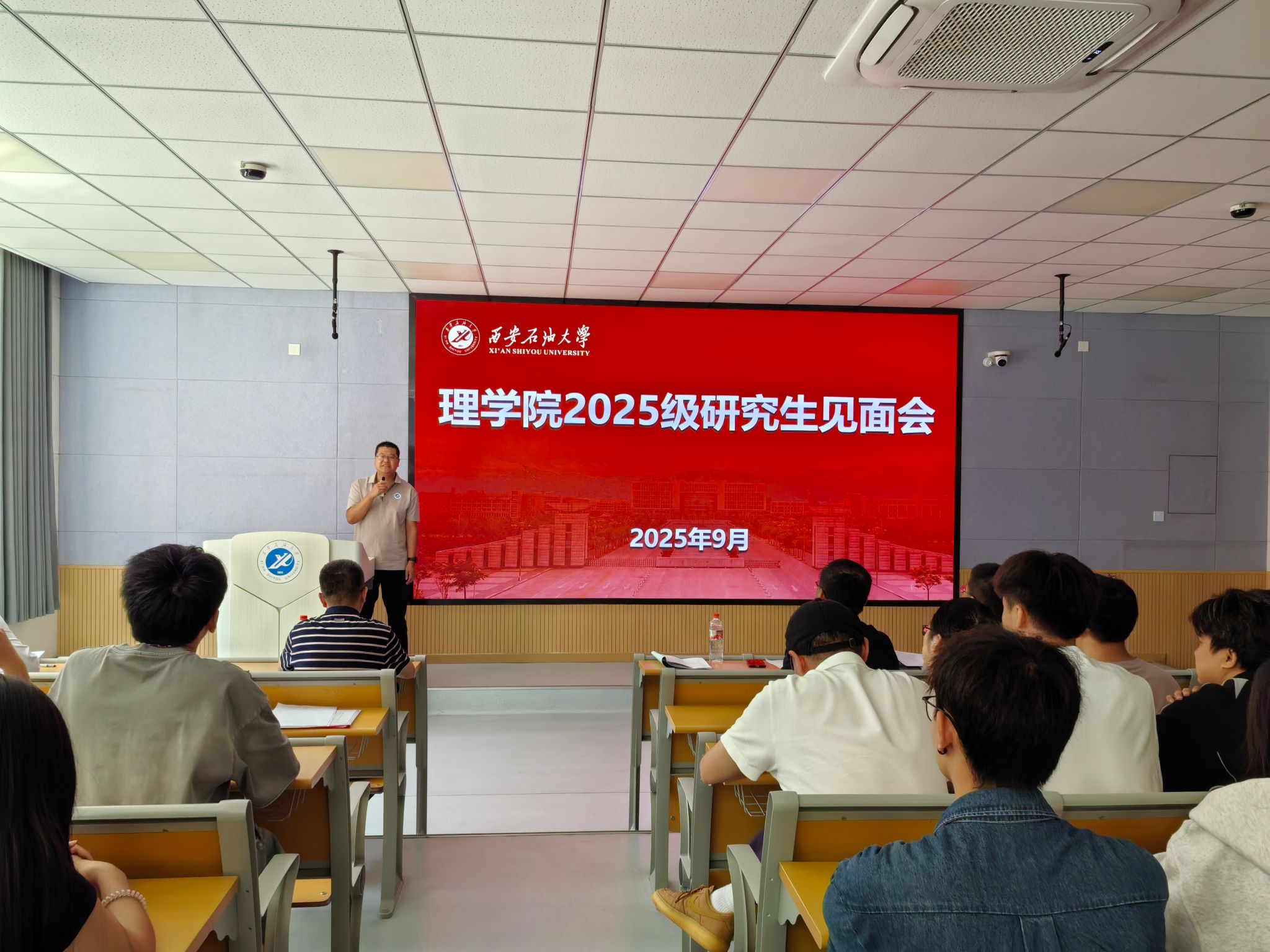 9月8日下午,理学院在鄠邑校区博览楼A110室召开2025级硕士研究生见面会。学院党委书记席利哲、院长折延宏、党委副书记杨富民,副院长刘帅、马儇龙,导师代表丁继军,研究生辅导员马小梅及全体2025级硕士研究生参加了本次大会。会议由党委副书记杨富民主持。