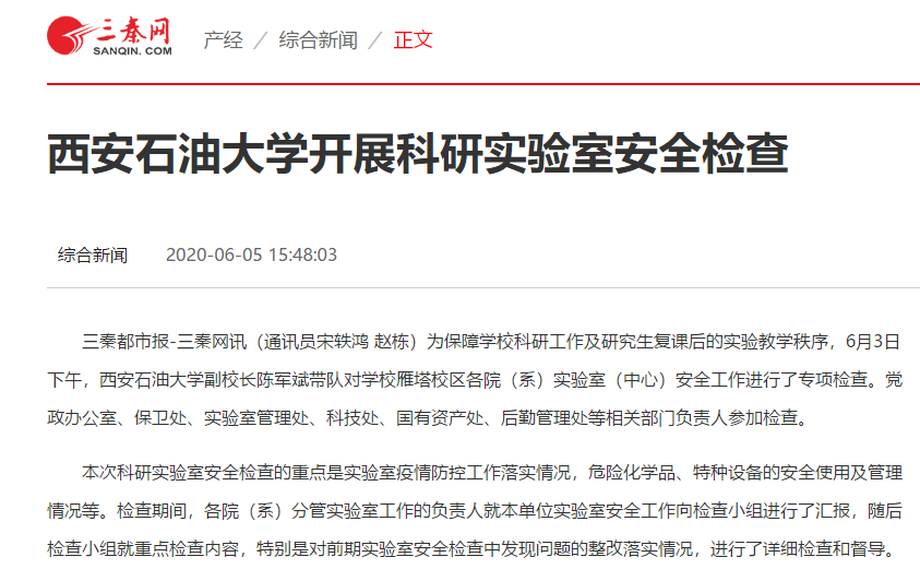 检查发现,各院(系)对实验室安全及疫情防控工作高度重视,较好地落实了学校的有关要求,实验场所的封闭管理及值班情况到位,均能按照实验室疫情防控工作要求,组织学生认真做好实验室通风换气、日常消毒、实验室记录等日常工作,危化品及特种设备的管理较为规范。检查组就发现的问题和隐患及时反馈给相关院(系),要求立即进行整改。各院(系)负责人表示将按照检查组提出的要求及时整改,尽快消除实验室安全存在的问题和隐患。