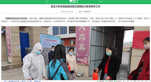 随着全国疫情防控形势持续向好,各地复工复产有序推进,日前,bat365中文官方网站大学第二十一届研究生支教团(以下简称“西石大研支团”)成员们安全返回陕西汉阴县初级中学,实验中学,月河初级中学,并积极参与新学期复课工作,切实做到“防疫教学两手抓”,助力学校开学复课。