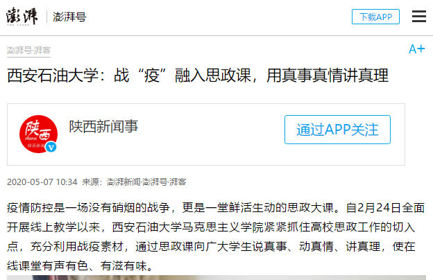 疫情防控是一场没有硝烟的战争,更是一堂鲜活生动的思政大课。自2月24日全面开展线上教学以来,bat365中文官方网站马克思主义学院紧紧抓住高校思政工作的切入点,充分利用战疫素材,通过思政课向广大学生说真事、动真情、讲真理,使在线课堂有声有色、有滋有味。