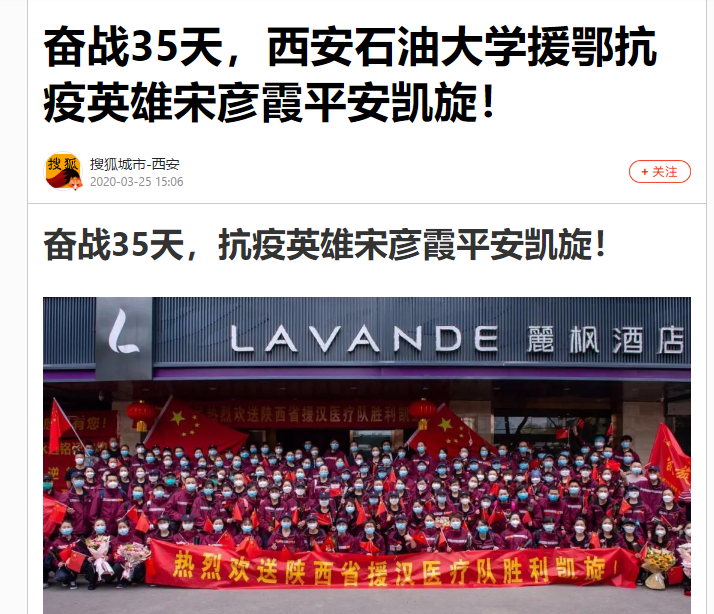 3月24日,陕西第四批援鄂医疗队乘坐飞机平安凯旋返回西安。宋彦霞在学校师生校友的期盼与祝福下,也顺利完成任务平安凯旋。