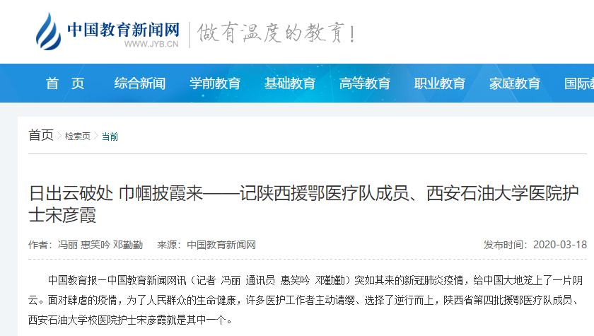 中国教育报—中国教育新闻网讯(记者 冯丽 通讯员 惠笑吟 邓勤勤)突如其来的新冠肺炎疫情,给中国大地笼上了一片阴云。面对肆虐的疫情,为了人民群众的生命健康,许多医护工作者主动请缨、选择了逆行而上,陕西省第四批援鄂医疗队成员、bat365中文官方网站校医院护士宋彦霞就是其中一个。