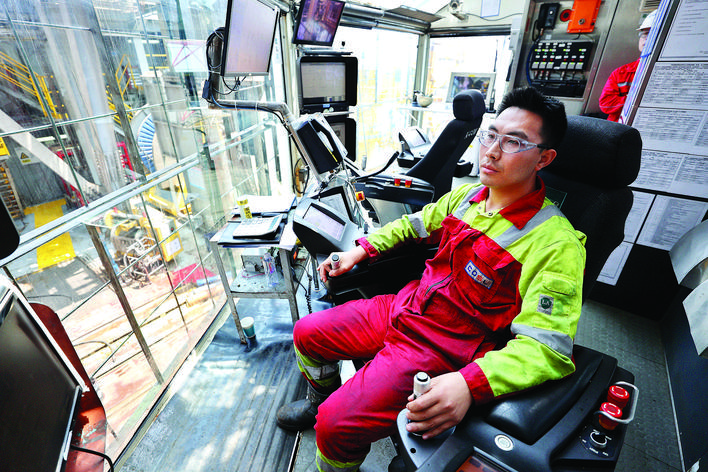 从作业区的甲板层爬楼梯进入司钻房大概有五六层楼高,需要3分钟左右。但这短短的3分钟路程,是一个不断“升级打怪”的过程,需要一步步经过各种考核、拿到各种证件,具备充足的技能后,才能坐上司钻的操作椅。进入中海油服后,我跟着师傅认真学习,刻苦钻研技术,从甲板工到钻工、井架工,我用了7年时间。
